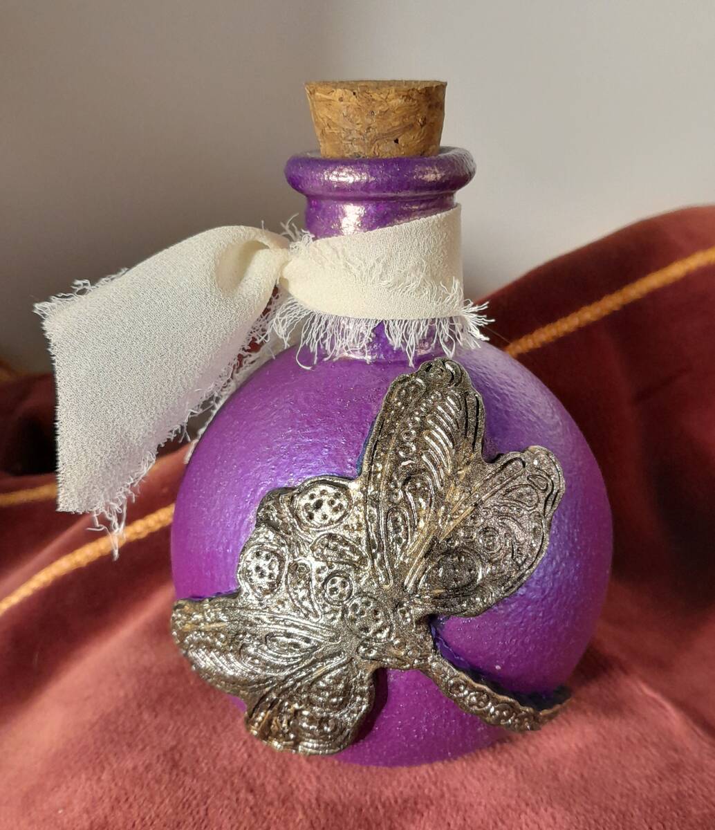 Simple elegance comes to mind with this gorgeous purple glass jar. Adorned with a bronzed Dragonfly and a creamy soft ribbon.