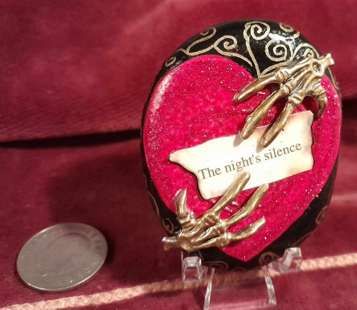 A unique stunner. Golden skelly hands embrace a bleeding broken and lonely heart. The Night's Silence.