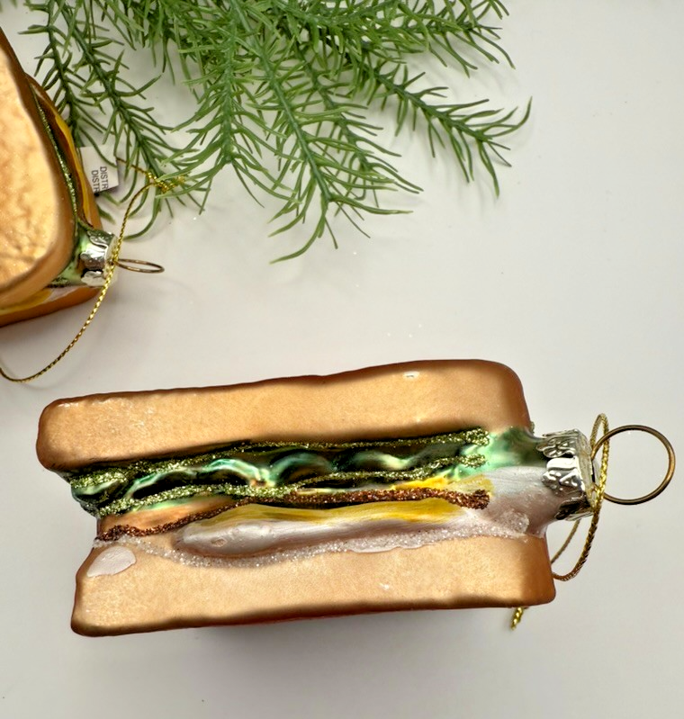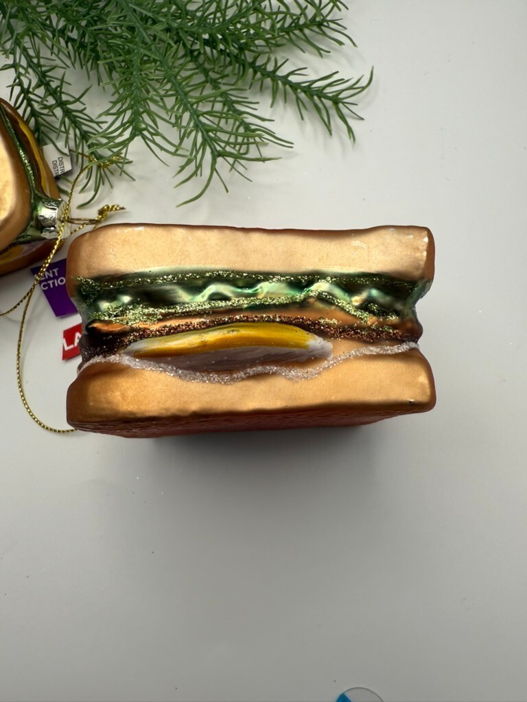 Add a dash of diner charm to your holiday tree with this set of 3 glass cheeseburger ornaments, crafted with mouthwatering detail! Each ornament features shimmering golden ?toasted bread,? a layer of juicy brown beef patty, bright green pickle, and melty cheese accents dusted with glitter.
