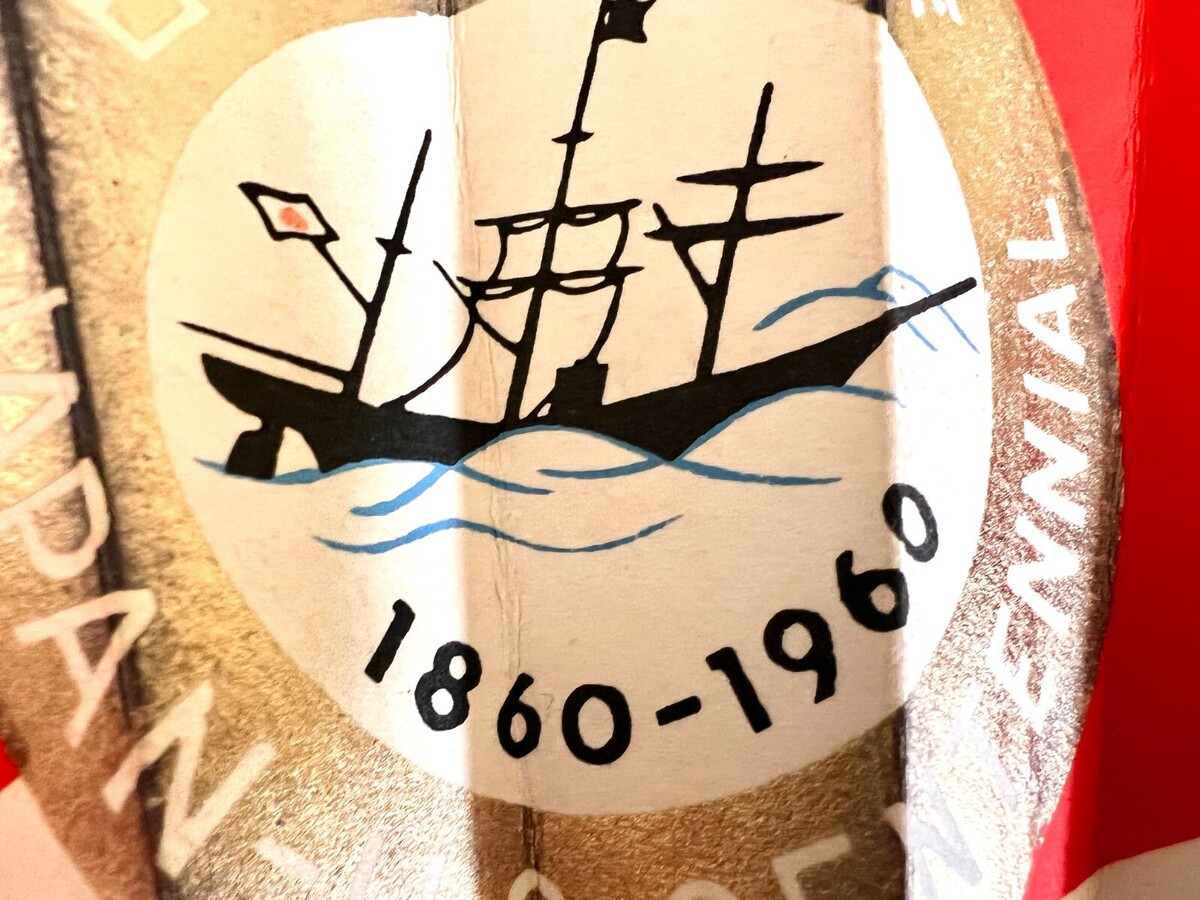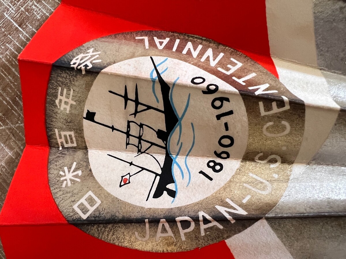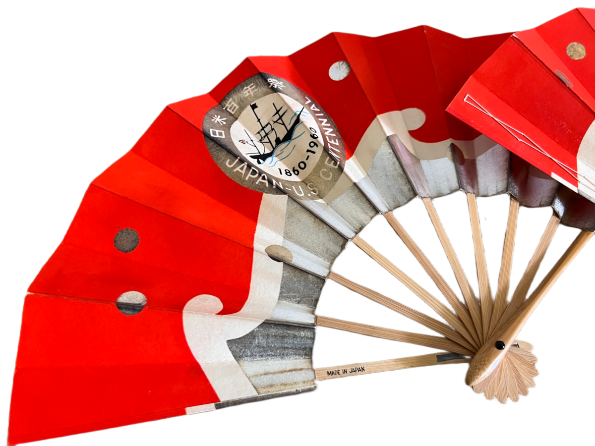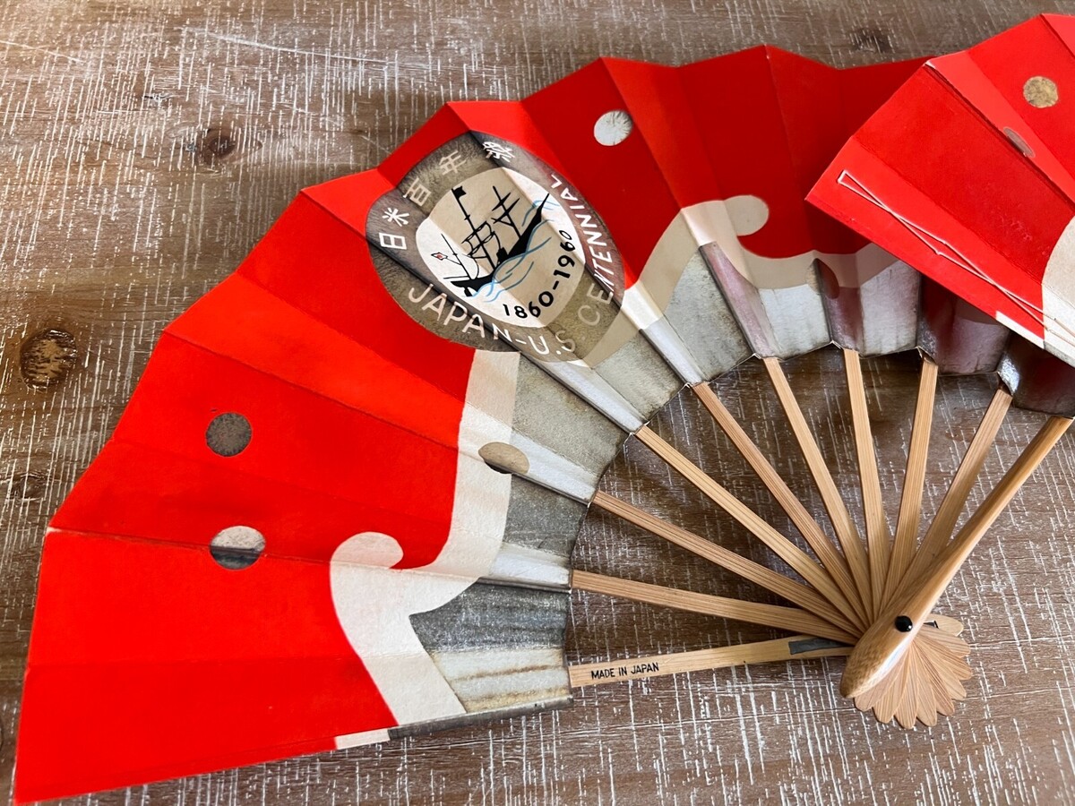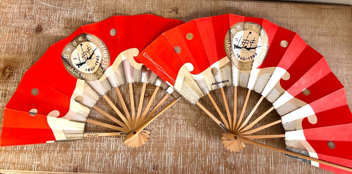 Heavy paper vintage fans with bamboo tines; the paper part is red with silver and gold metallic paint, a large seal of the Japan-US Centennial 1860-1960 on front and back. stamped Japan Tourist Association on one side. Excellent condition as these have been stored since they were purchased. Only flaw is one side of one fan, the paper has drawn away from the wooden stick. They measure 10 " x 19".