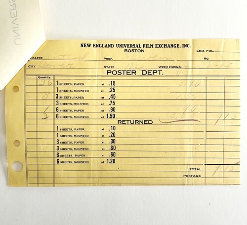 Invoice from Universal Films New England Film Exchange to what was then Central Hall (now Center Theater) in Dover-Foxcroft, Maine for various things (listing many so contents vary) like film rental, tickets, posters, etc....