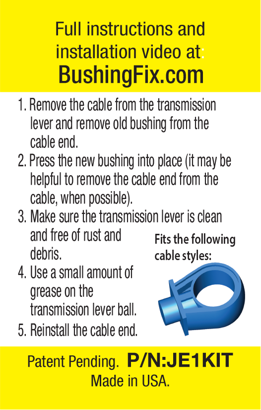 The kit replaces the bushing on the interior end of the cable located at the base of the gear shifter.