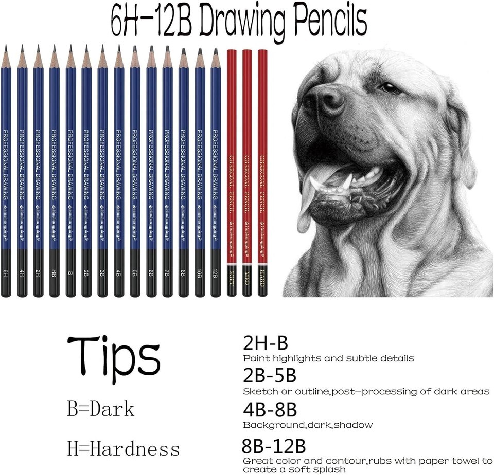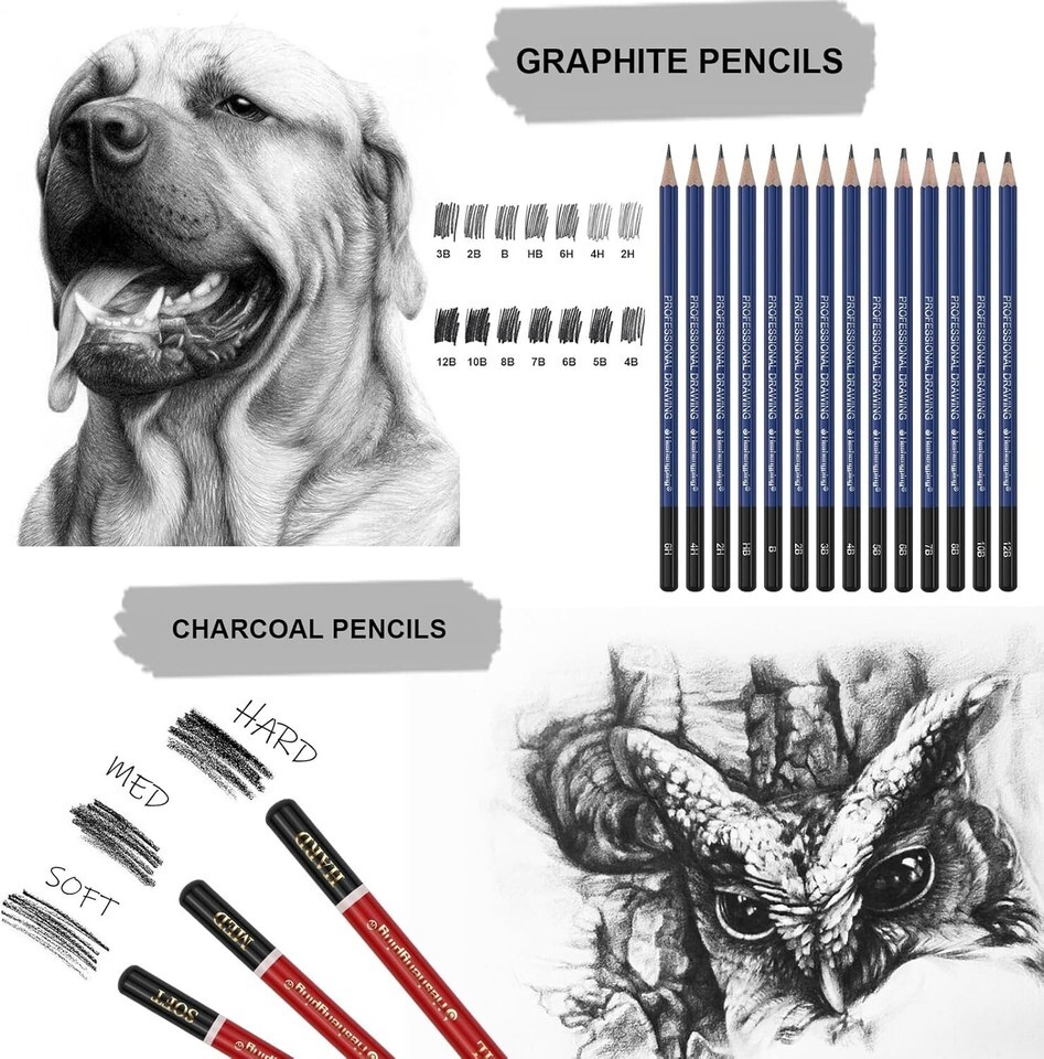 Quality 17pcs Drawing Sketch Pencils - A wide variety of hardness for all your artwork needs. has 14 pre sharpened pro quality graphite pencils (12B 10B 8B 7B 6B 5B 4B 3B 2B B HB 2H 4H 6H). 3 charcoal pencils ( soft, medium, hard ), A smooth writing feeling, quality sketch pencil for writing shading.