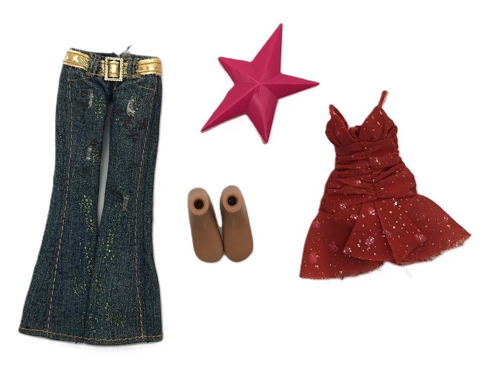 Bratz Passion For Fashion Jade Dress, Jeans, Feet and Brush. The clothing is in good, clean, pre-owned condition. Calculated shipping is applied to cart when you purchase