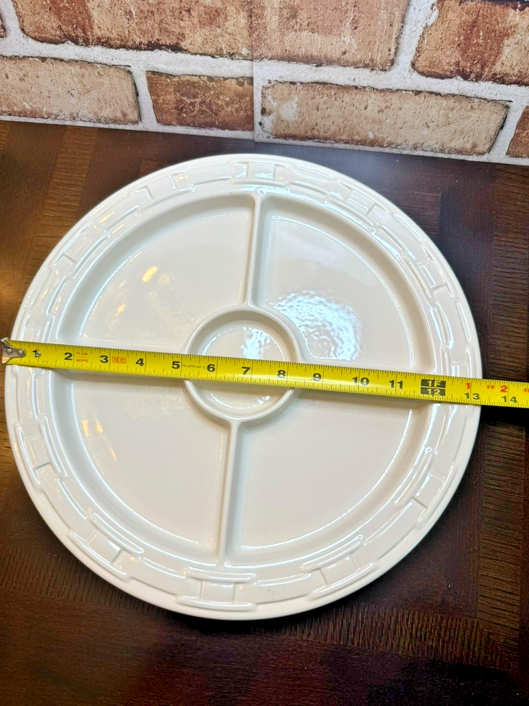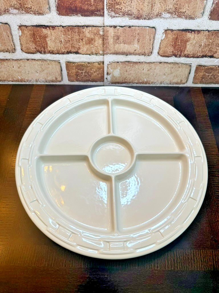Classic Longaberger quality pottery piece ? a large 12" divided serving tray in ivory with the signature basketweave border. Perfect for entertaining, everyday use, or display alongside your Longaberger baskets and dinnerware.