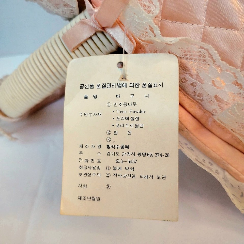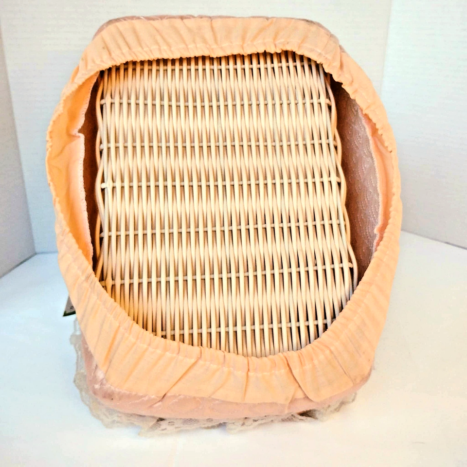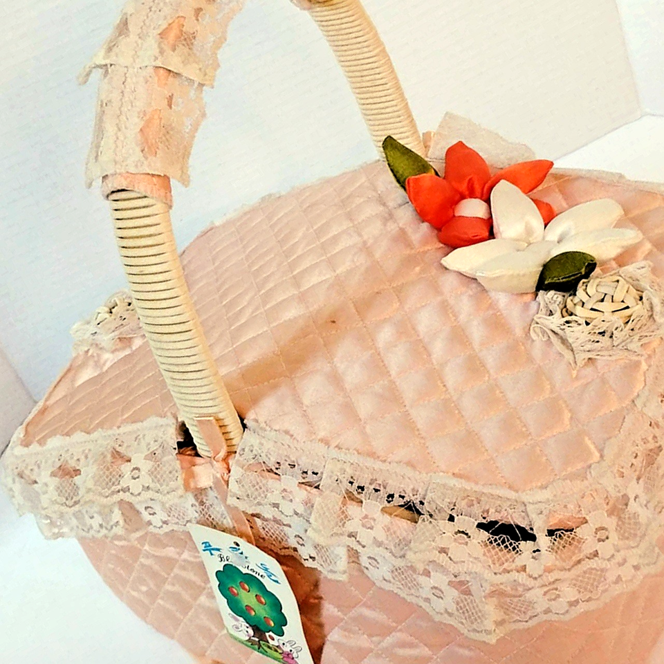 Vtg Wicker Sewing Picnic Basket Quilted Pink Satin Lace Floral Applique Korea