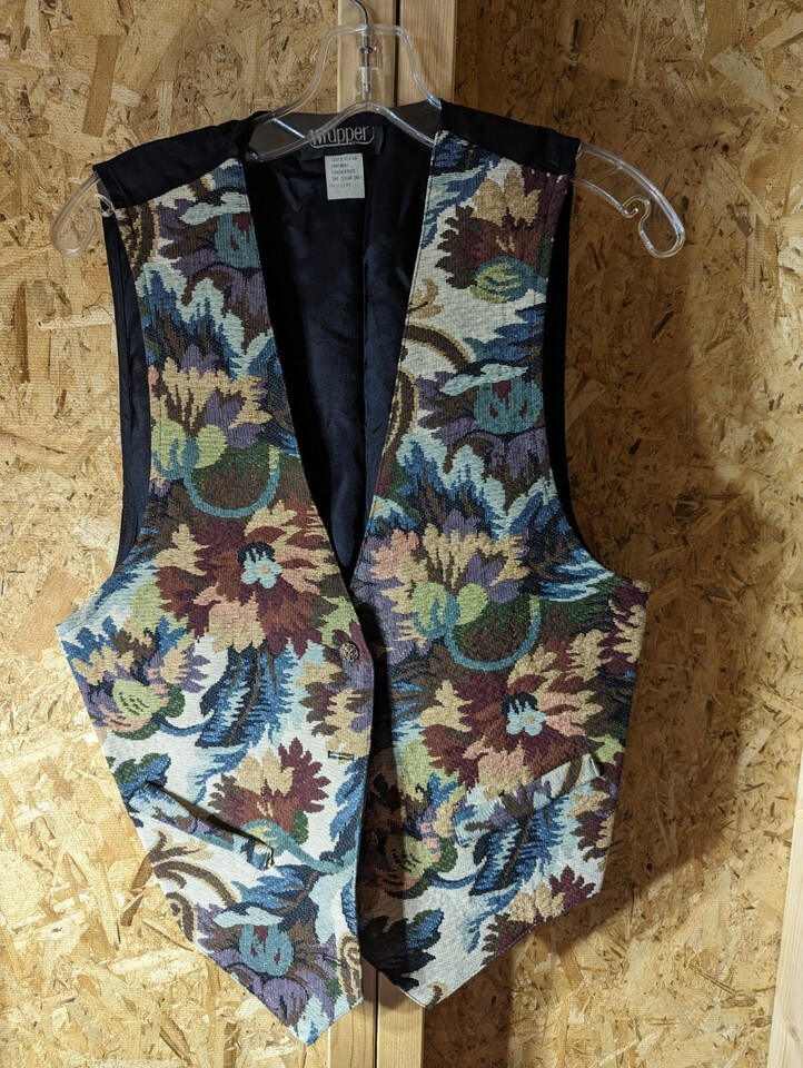 Make a fashion statement with this Wrapper ladies vest that boasts a lovely floral pattern. The vest is made of a polyester blend and comes in a size medium. It features a button closure and is perfect for layering on chilly days. This vintage piece has a stylish short length and is in excellent condition.