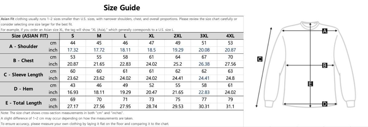 Asian Fit refers to clothing tailored for body shapes commonly found in Asian populations. These items typically run 1-2 sizes smaller than U.S. sizes, with narrower shoulders, chest, and overall proportions. Please check the size chart carefully or consider sizing up for the best fit.
