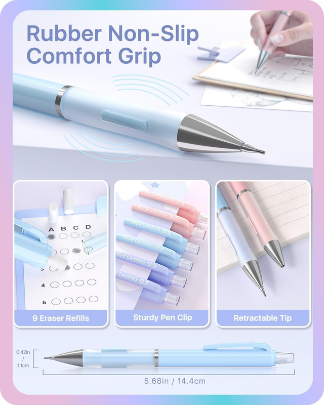 Every Detail Matters: Features a non-slip rubber grip for comfort, built-in eraser with refills, sturdy pen clip, and a retractable tip