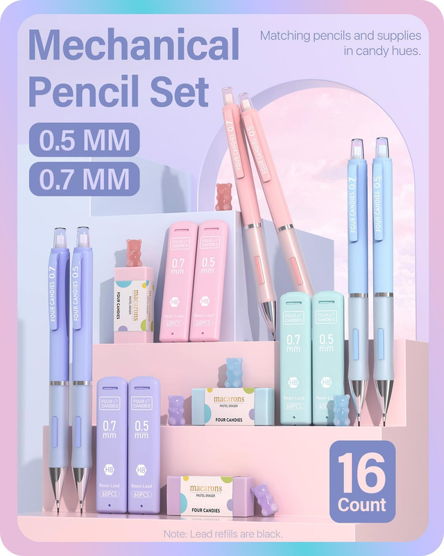 Value Pack: Contains 6 cute mechanical pencils, a bulk supply of 360 leads in 6 tubes, 3 pastel erasers, and 9 additional eraser refills
