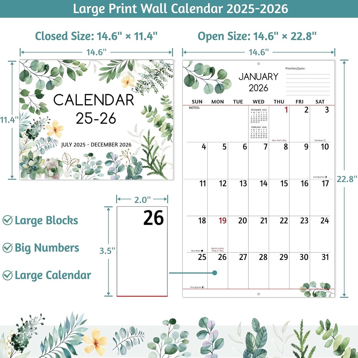 Wall Calendar 2025-2026 - Large Print Calendar, Jul 2025 - Dec 2026, 14.6 x 22.8