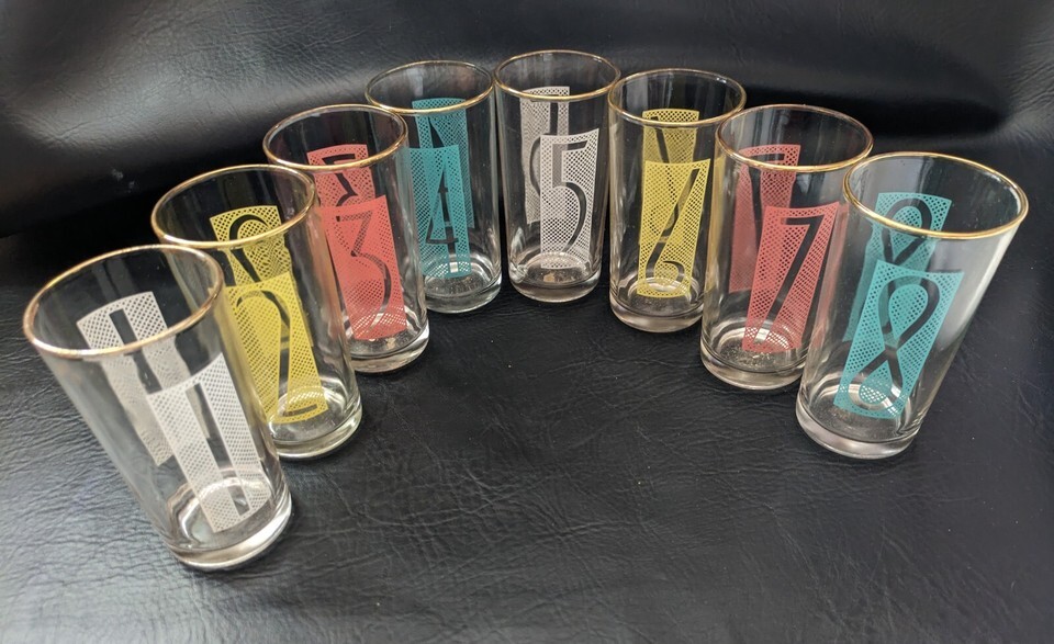 MCM 1960?s High Ball Glasses Lucky Number 1 2 3 4 5 6 7 8 Set Gold Rim