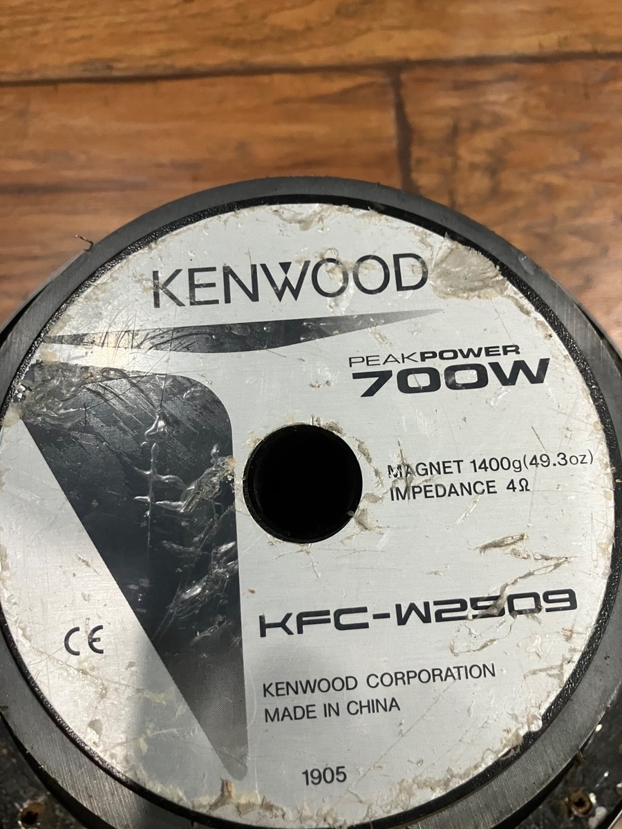 Pair if Kenwood KFC-W2509 10" 4-ohm subwoofers. These were in a poorly assembled homemade box that was falling apart. Tested good, great for DIY box system.