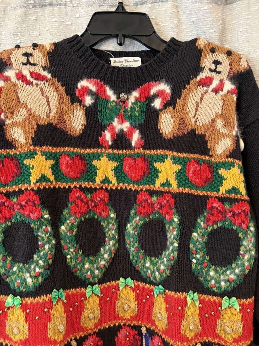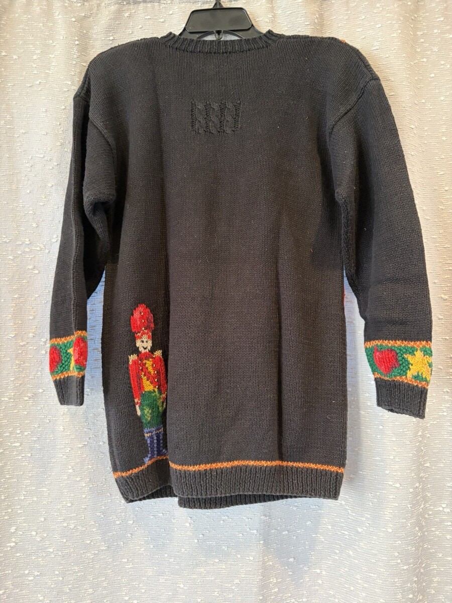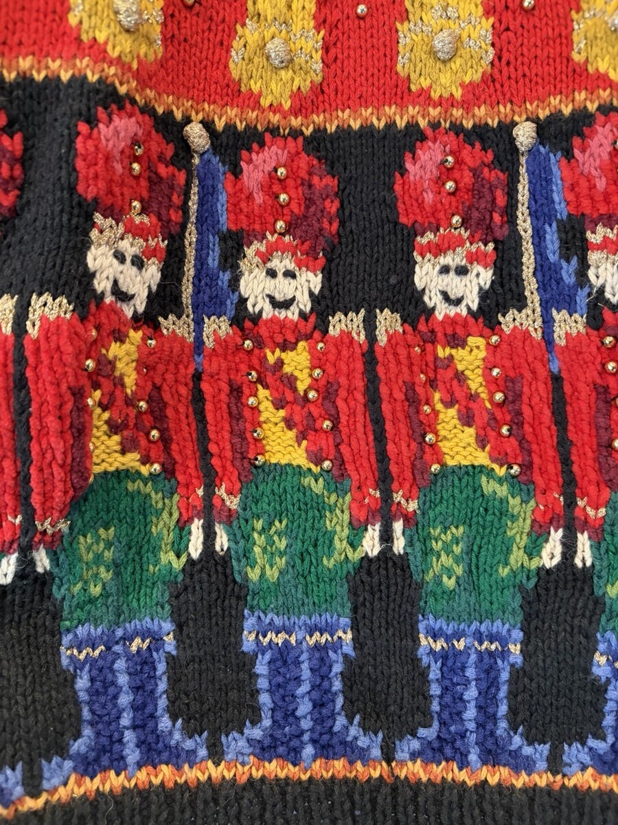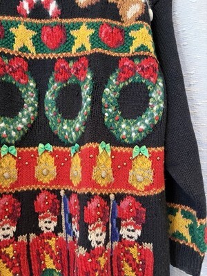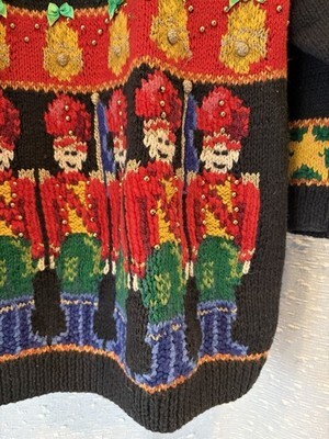 Vtg Marisa Christina Hand Knit Embellished Holiday Sweater Nutcrackers & Bears M