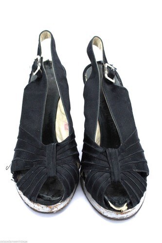 VTG WW2 1940s Shoes 5.5 Black Silk Leather/Silver Peep Toe Sling Back Platforms