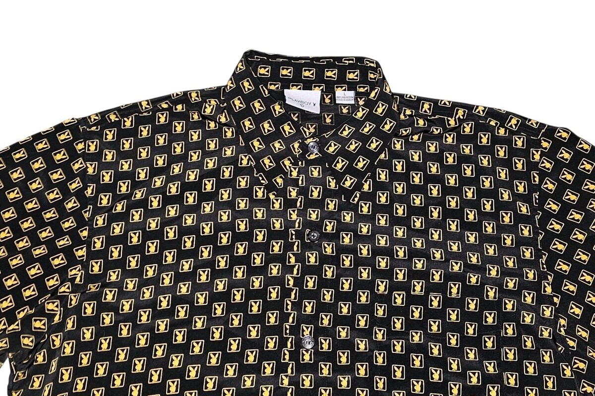 Vintage 90s Playboy Magazine Button Up Shirt Loop Collar All Over Print Logo L