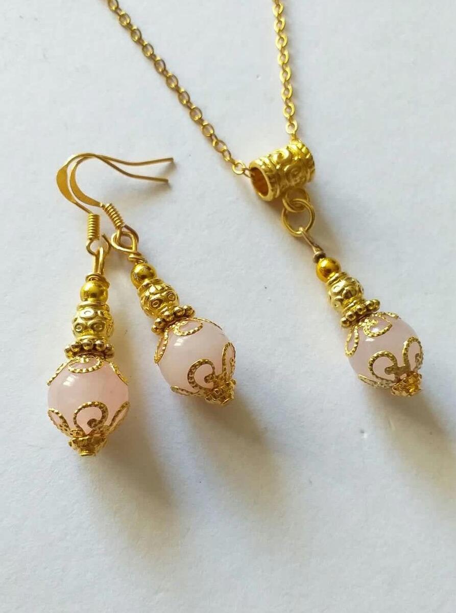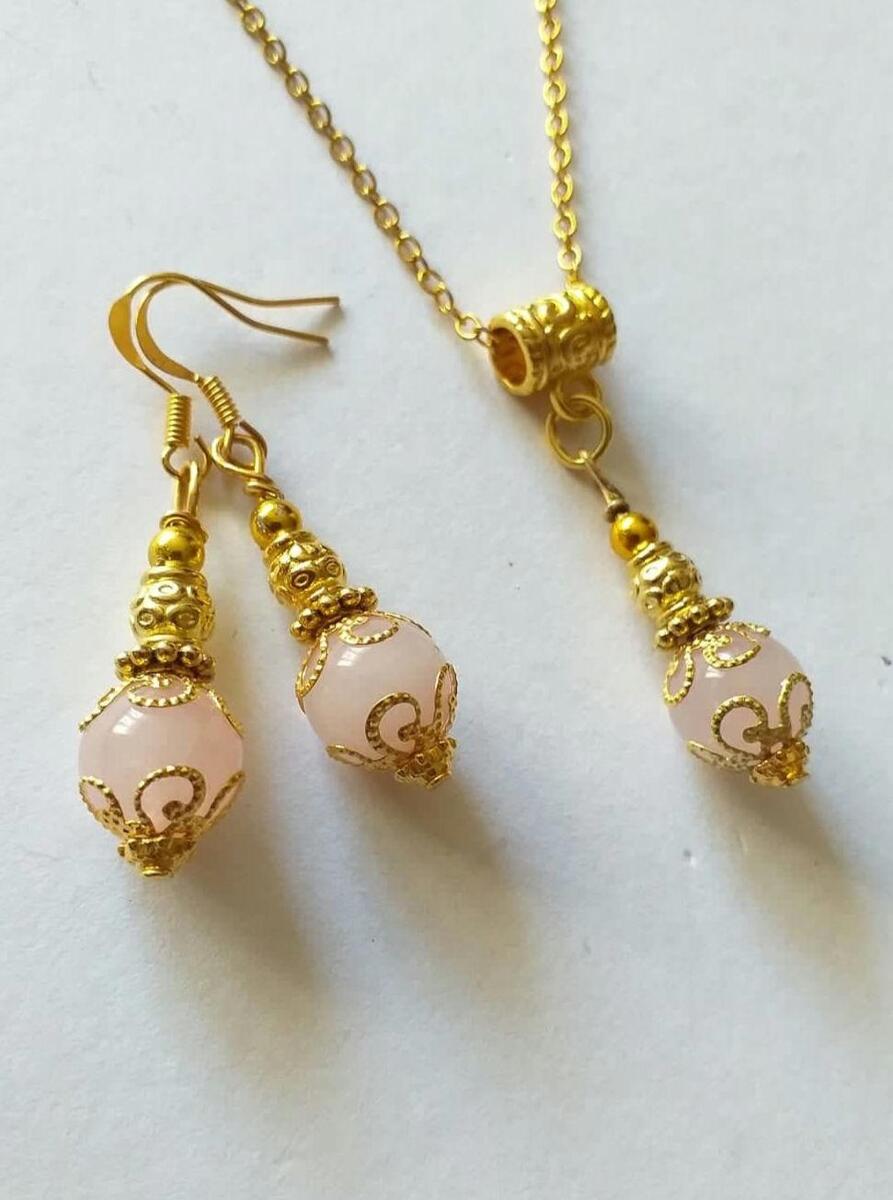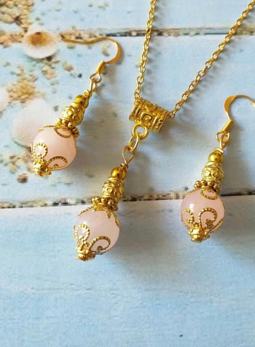 Beautiful Victorian Rose quartz filigree gold-tone jewelry set earrings and necklace. Rose quartz earrings . Rose quartz necklace. Rose quartz jewelry set. Dangle earrings . Rose quartz Boho jewelry set earrings and necklace . Bohemian jewelry set necklace and earrings . Rose quartz and beautiful gold-tone ornaments earrings and necklace jewelry set . Vintage style jewelry set . Antique style jewelry set. Rose quartz jewelry set.