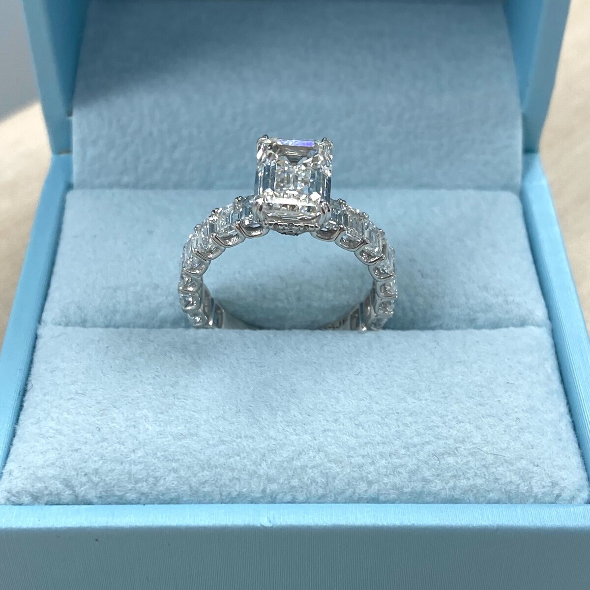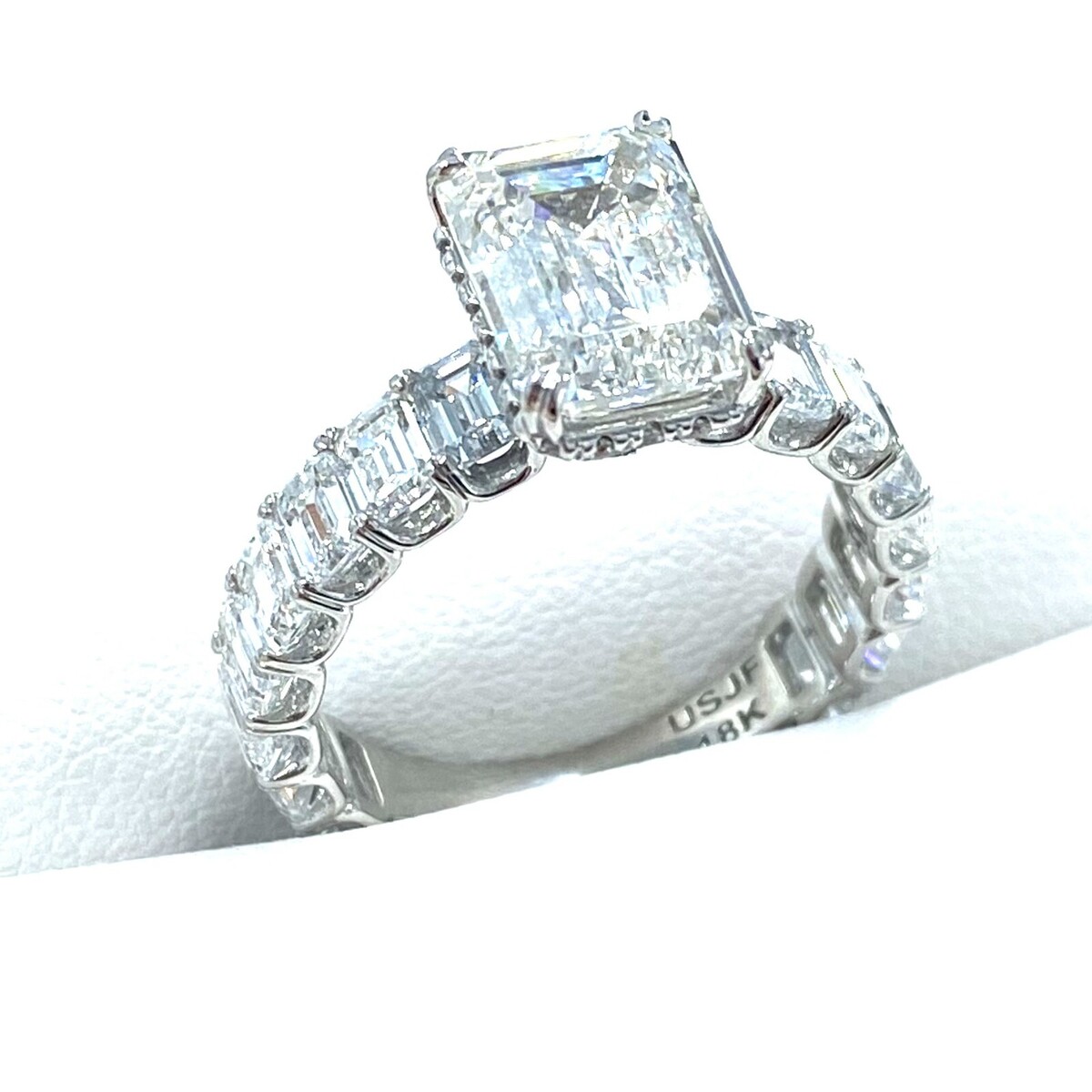 Setzen Sie ein mutiges Statement mit diesem exquisiten Verlobungsring mit Labordiamanten im Smaragdschliff. Dieser aus glanzendem 18-karatigem Weißgold gefertigte Ring verfügt über ein atemberaubendes Herzstück: einen im Labor gezüchteten Diamanten der Farbe E VVS2 Clarity mit 3,05 Karat und Smaragdschliff. Der Reiz des Rings wird durch ein verstecktes Halo-Design noch verstarkt, bei dem kleine Diamanten im Rundschliff unter dem Mittelstein eingefasst sind, um die Illusion eines großeren Diamanten zu erzeugen. Das Band ist mit smaragdgrünen Diamanten im Ewigkeitsstil besetzt, die die unendliche Liebe und Hingabe zwischen Ihnen und Ihrem Partner symbolisieren. Das Gesamtkaratgewicht betragt 6,38 Karat.