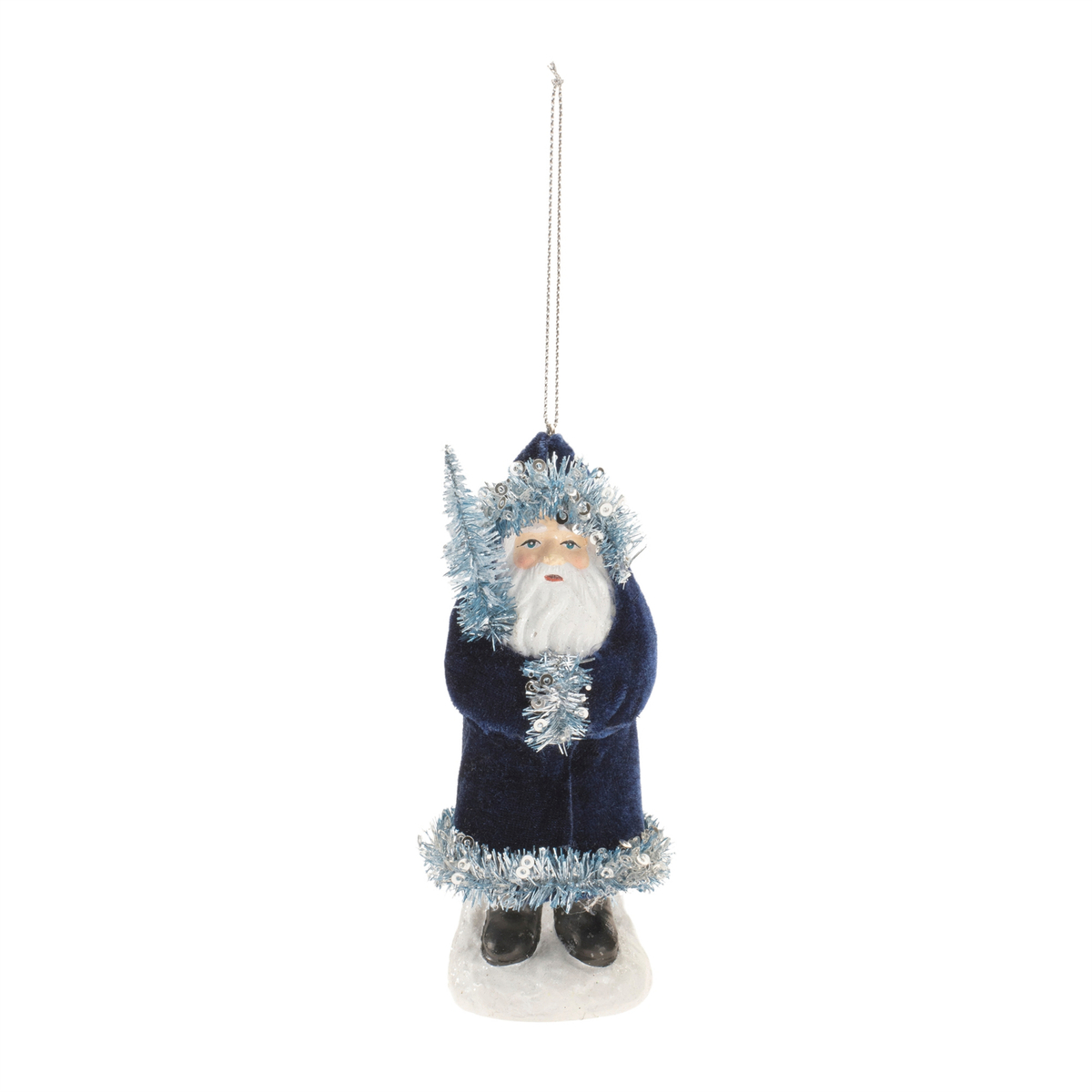 Celebrate the season with this charming Santa Ornament, dressed in rich blue and trimmed with sparkling tinsel. Crafted from paper pulp with hand-finished details, this nostalgic piece adds a vintage touch to your holiday d cor. Perfect for tree decorating or gifting, it brings timeless Christmas magic to every celebration.
