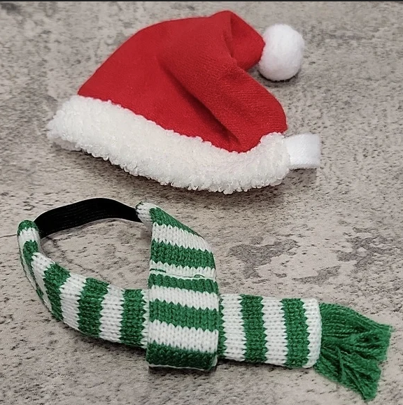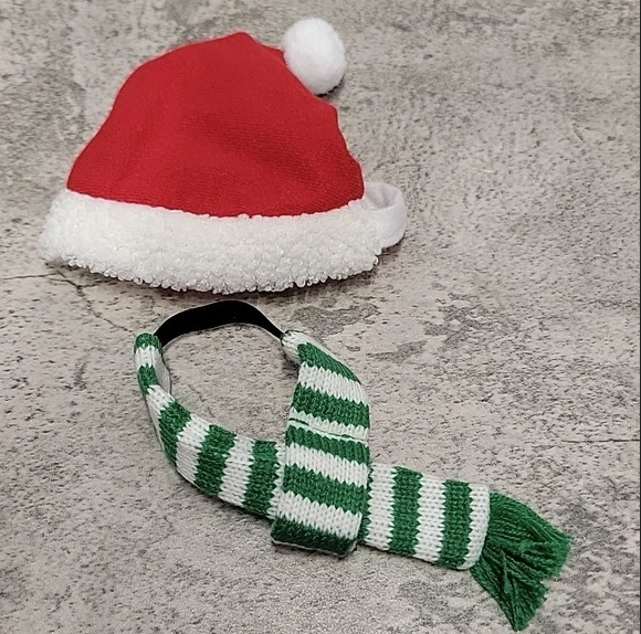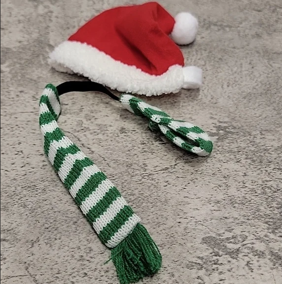 Includes one red Santa hat and one green white striped scarf