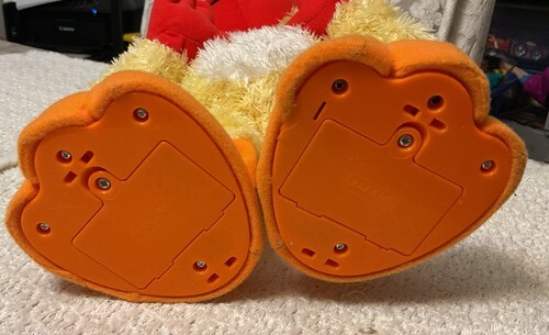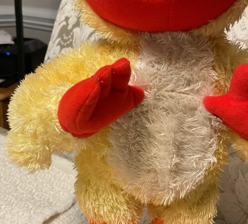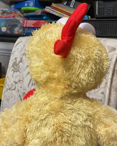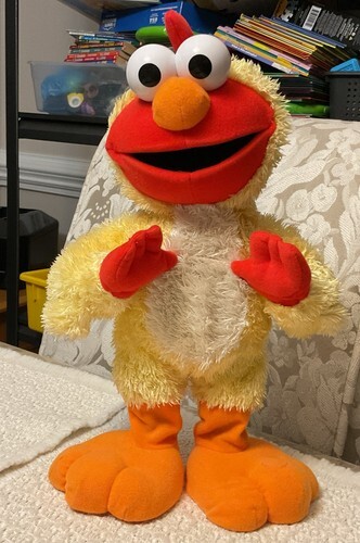 "Elmo does the classic chicken dance in a totally new hip way! Adorable Elmo, dressed in up in a fuzzy chicken suit, moves his legs and flaps his arms as he sings the 'Chicken dance' song. During the chorus and anytime you press his foot, Elmo will move his head in an adorable action that is sure to get you laughing and moving too!"