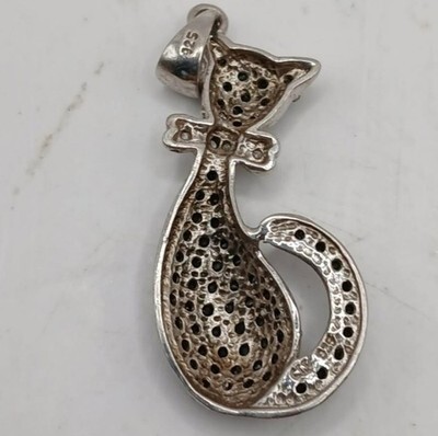 Sterling Silver Black White Synthetic CZ Cat with Bow Pendant