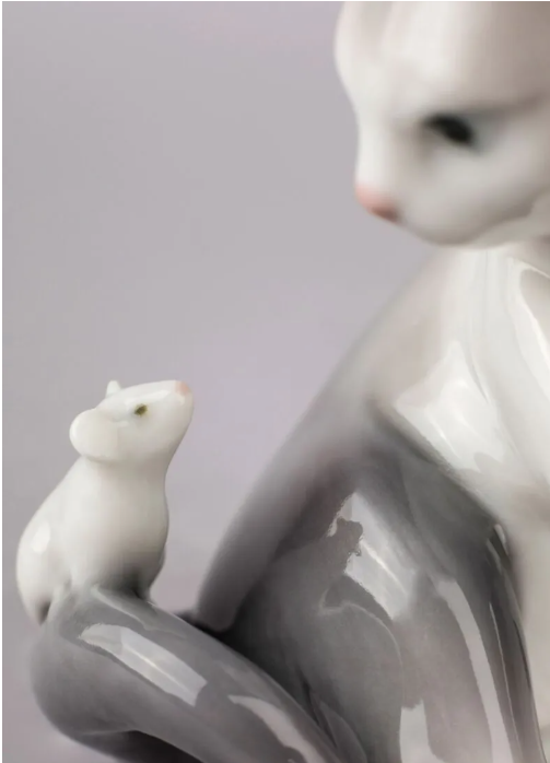 LLADR Glossy Porcelain Figure Cat and Mouse in White and Gray. Decorative Kitten