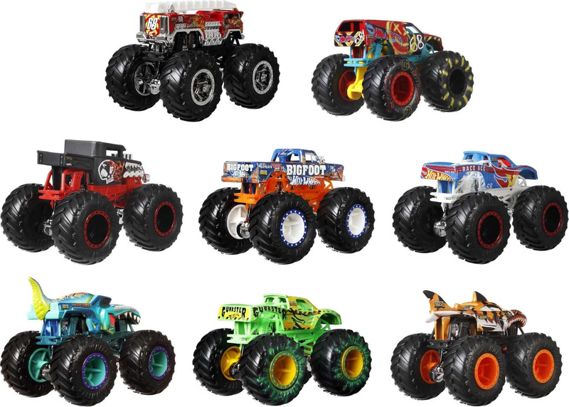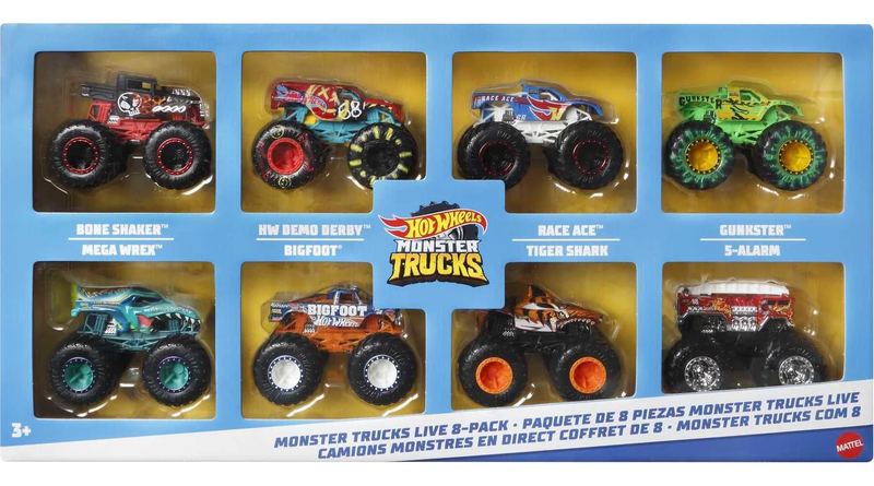 The Hot Wheels Monster Trucks Live 8-Pack features 8 fan-favorites in one ultimate pack Each Monster Truck is 1:64 scale and has the giant tires and sweet decos that kids and collectors love Included in the set are Race Ace, Bone Shaker, Tiger Shark, HW Demo Derby, Mega Wrex, HW 5-Alarm, Gunkster and Bigfoot for epic crashing right out of the package Reenact the destruction from the live show or create new stories with favorite characters This multipack makes a great gift for collectors and fans 3 years old and older, who love the excitement that Monster Trucks inspire