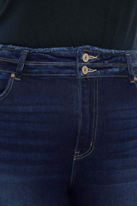 Introducing our Plus High Rise Double WB Fray Hem Flare Jeans, the perfect blend of style and comfort for your denim collection. Crafted in a dark stone wash with stretch denim, these jeans offer a flattering and flexible fit that hugs your curves in all the right places. The distressed detailing adds a touch of edgy flair, while the two-button zip fly closure ensures a secure and comfortable fit. The fray hem and flare leg silhouette create a trendy and retro-inspired look that's perfect for any occasion.