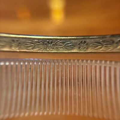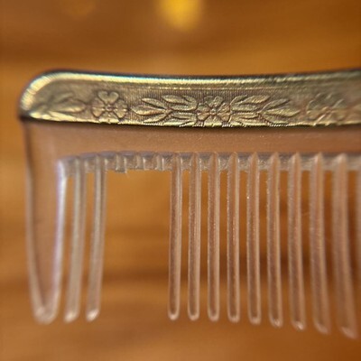 Beautiful vintage Art Deco celluloid comb featuring an ornately engraved brass or gold-tone metal top with intricate floral and leaf design. Made in the USA, circa 1920s-1940s.