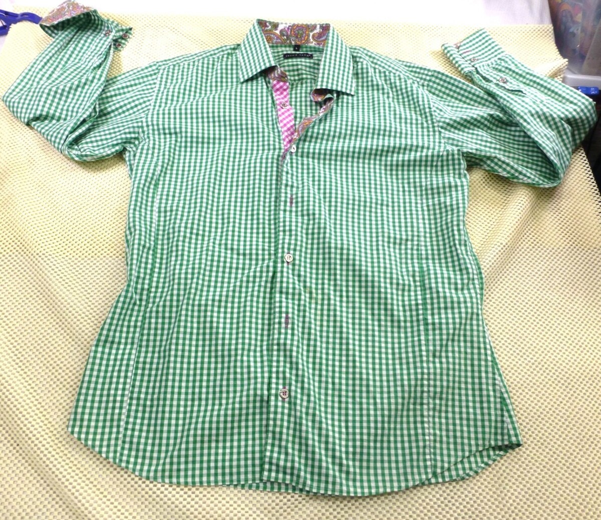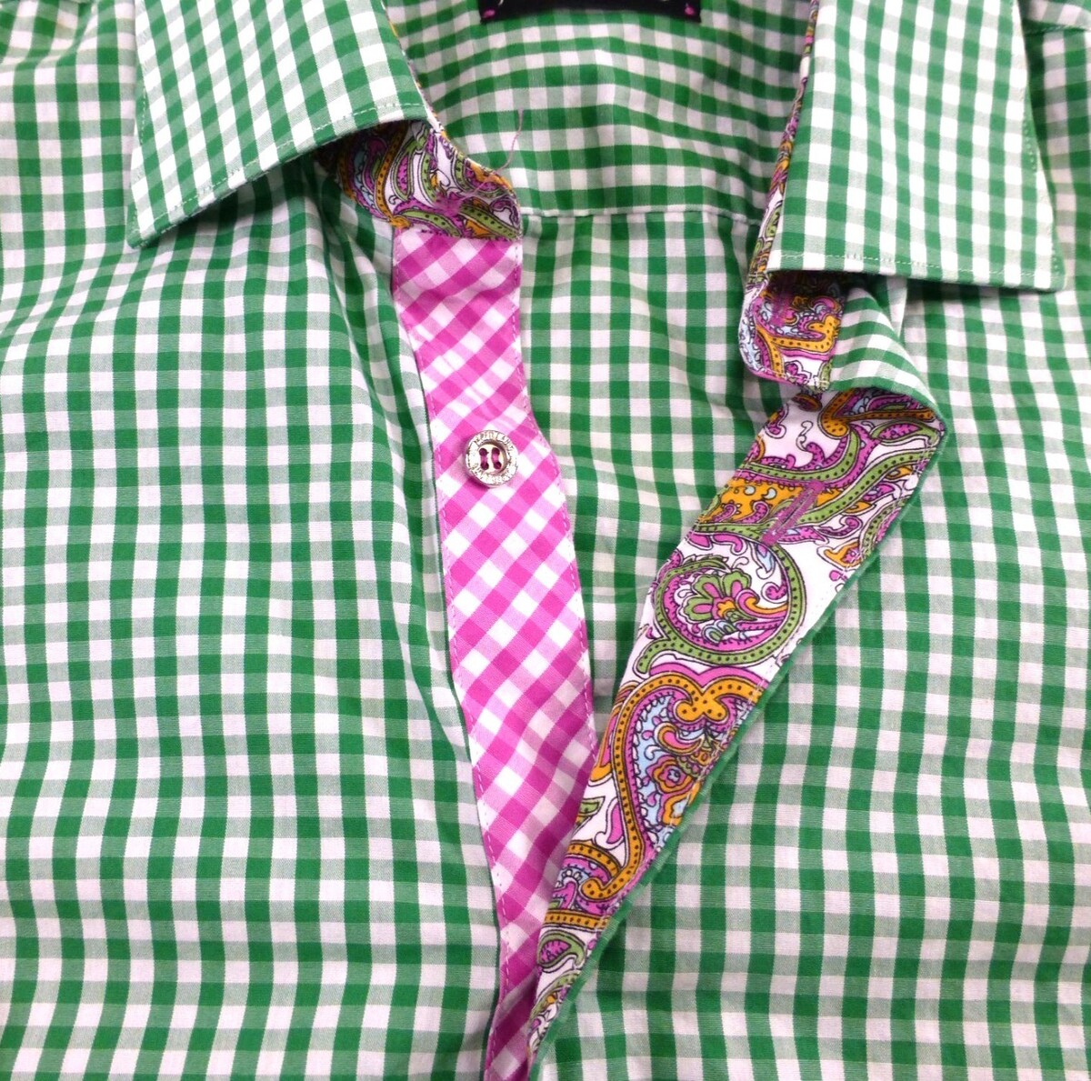 Jared Lang Flip Cuff Mens Green Gingham Check Long Sleeve Shirt Paisley Accents