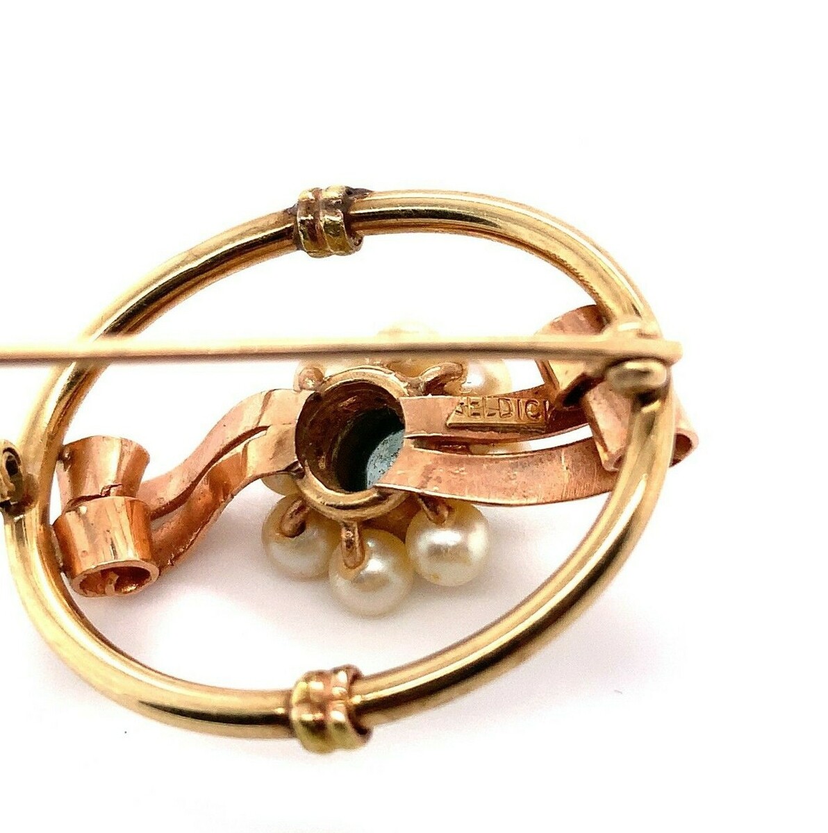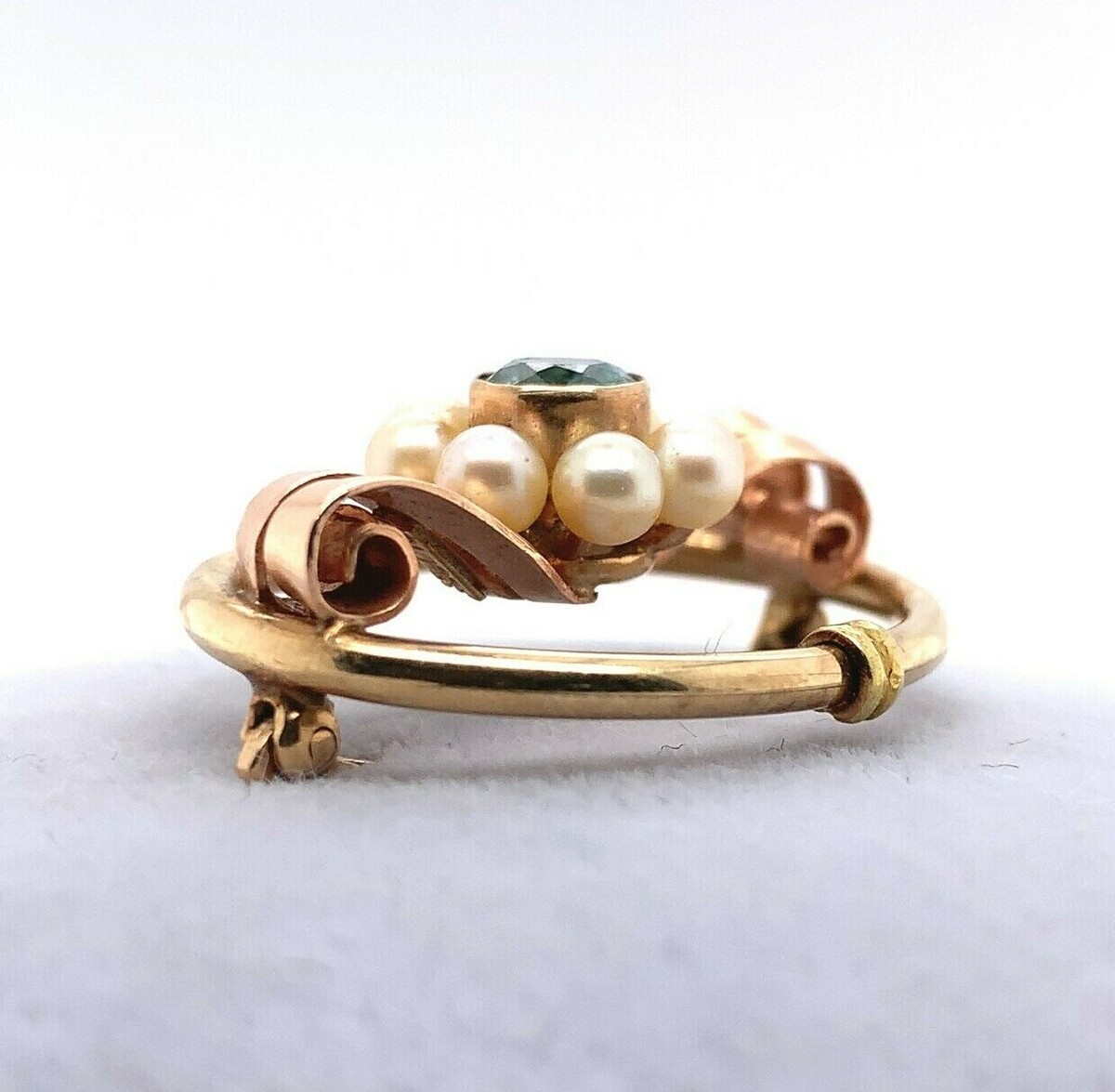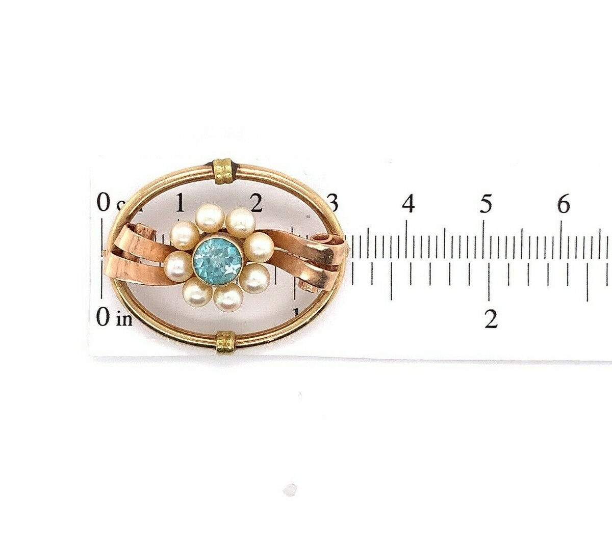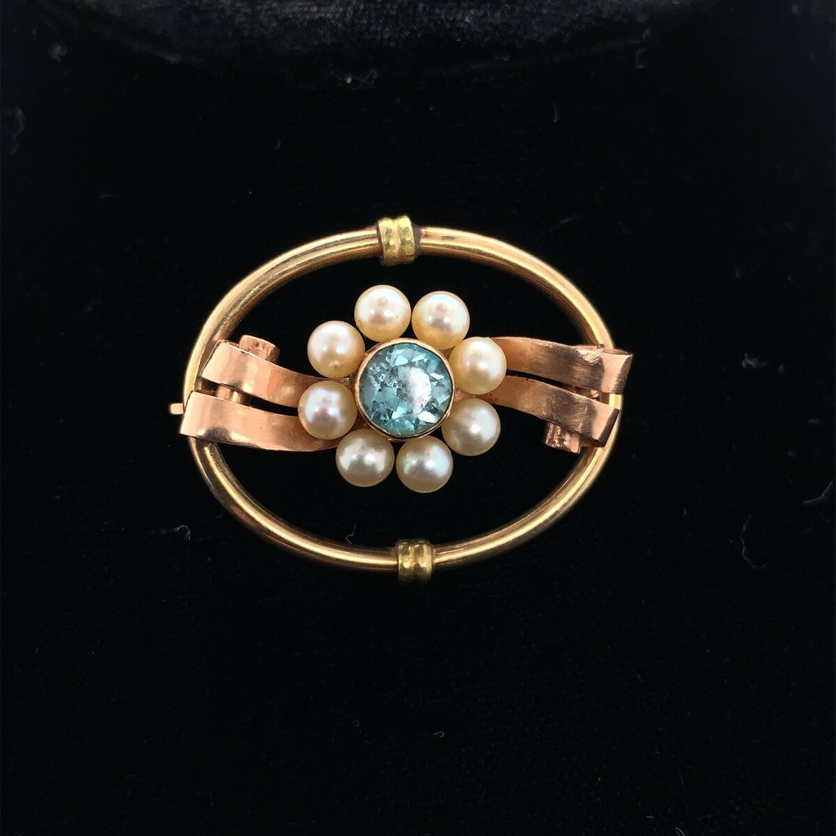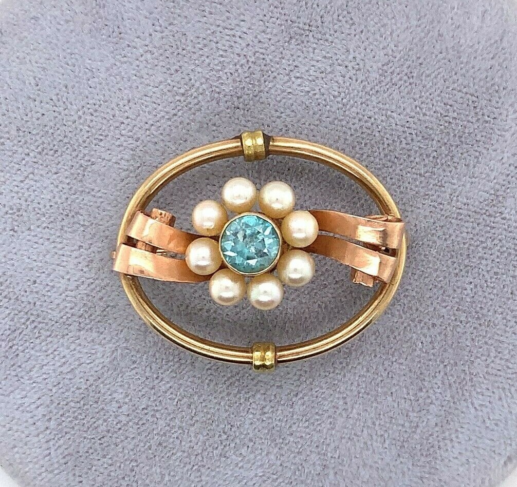 10k yellow gold pin with applied rose gold scrollwork featuring a genuine blue zircon gemstone and pearls. The blue zircon measures about 6.5mm round. The zircon has some abrasions and a chip on the pavillion. There are eight cultured pearls measuring about 4mm.