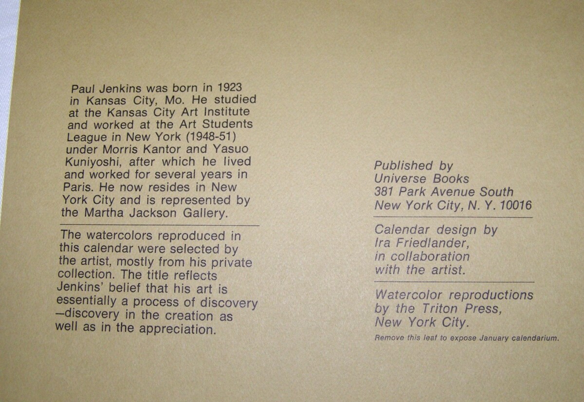 VINTAGE LARGE 1971 WALL CALENDAR “DISCOVERIES IN WATERCOLOR” by PAUL JENKINS-NEW
