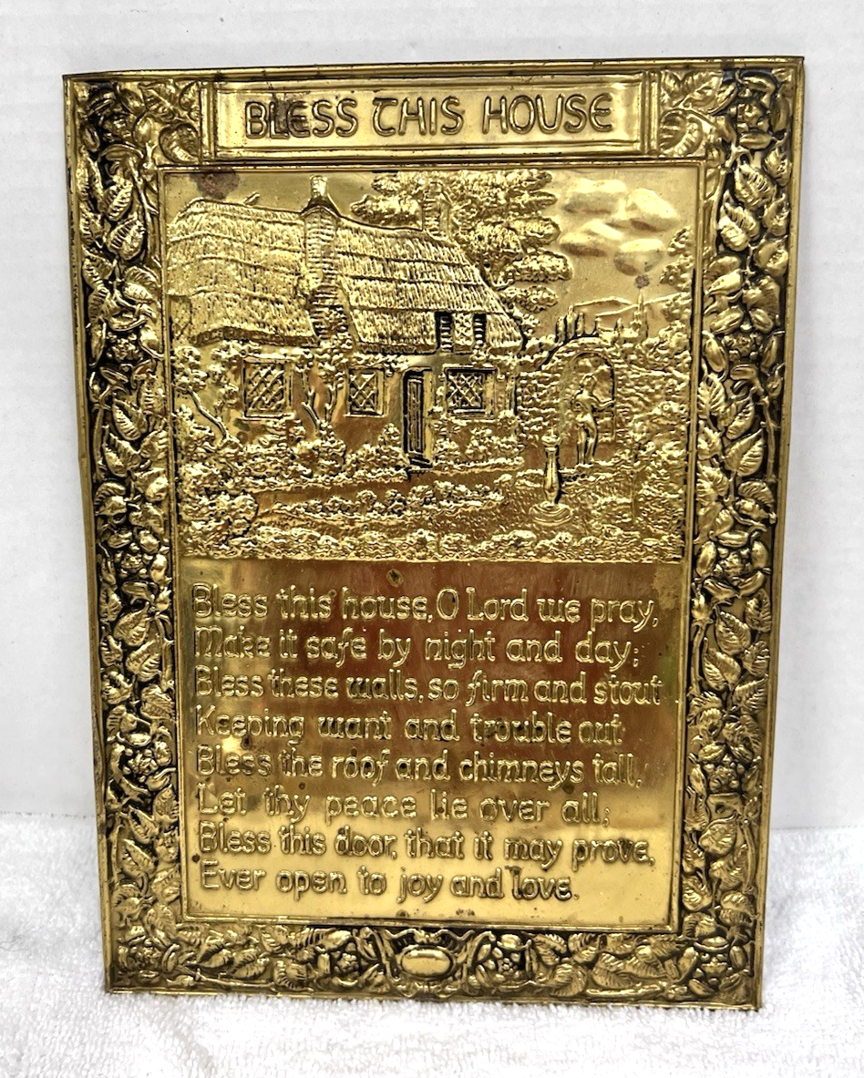 Vintage Boosey Hawkes Pressed Brass Thatched Cottage Bless This House 11 1/4" tall x 8 1/4 wide in good shape a few darker spots in the floral boarder edge