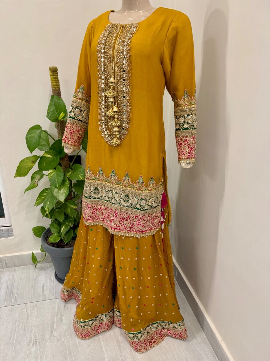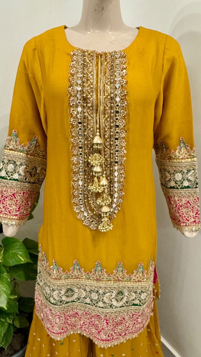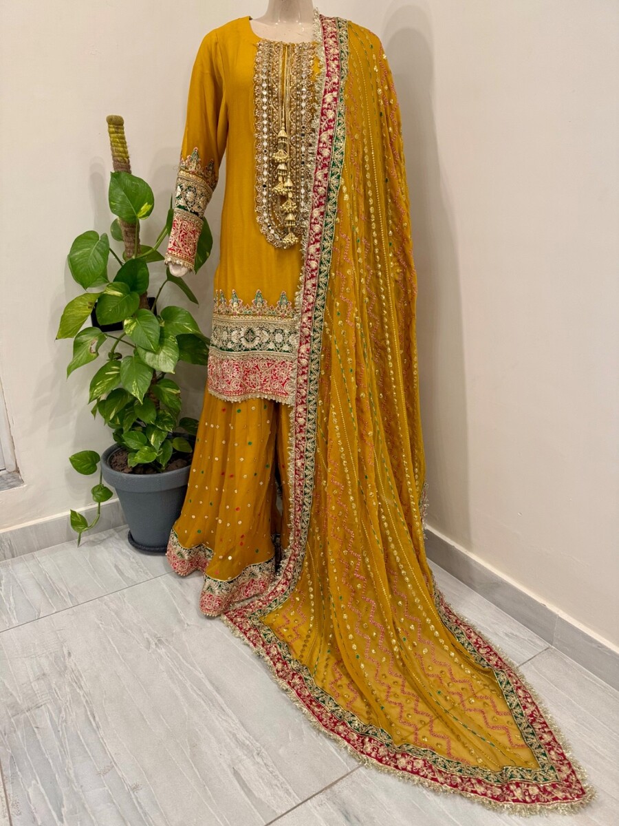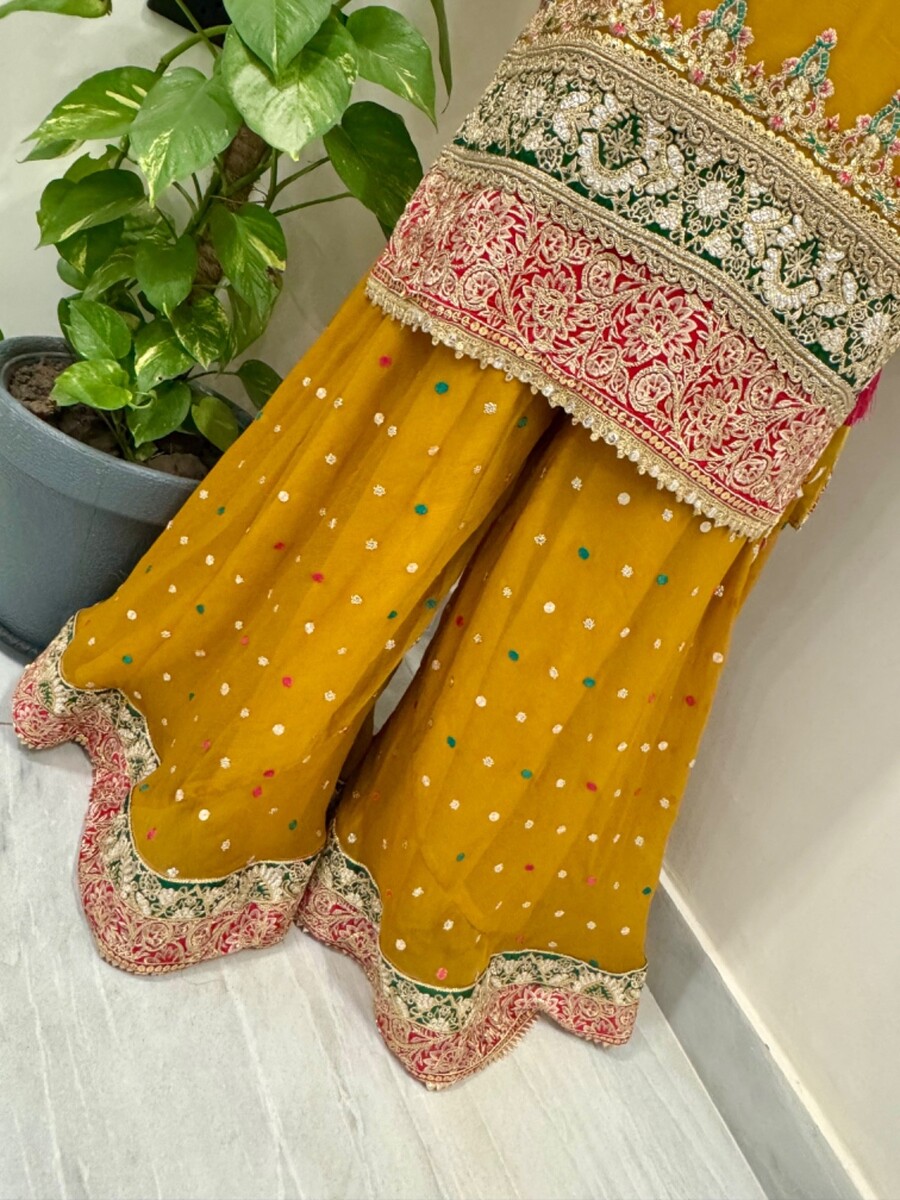 ? Yellow chiffon sharara with full thread embroidery Sequins work.