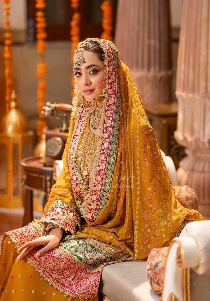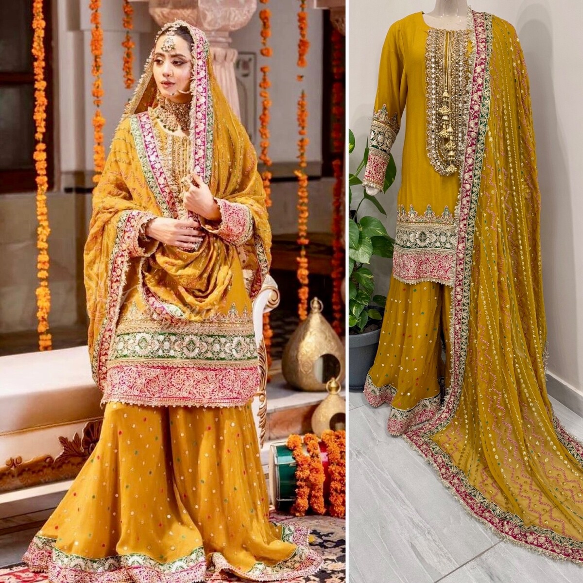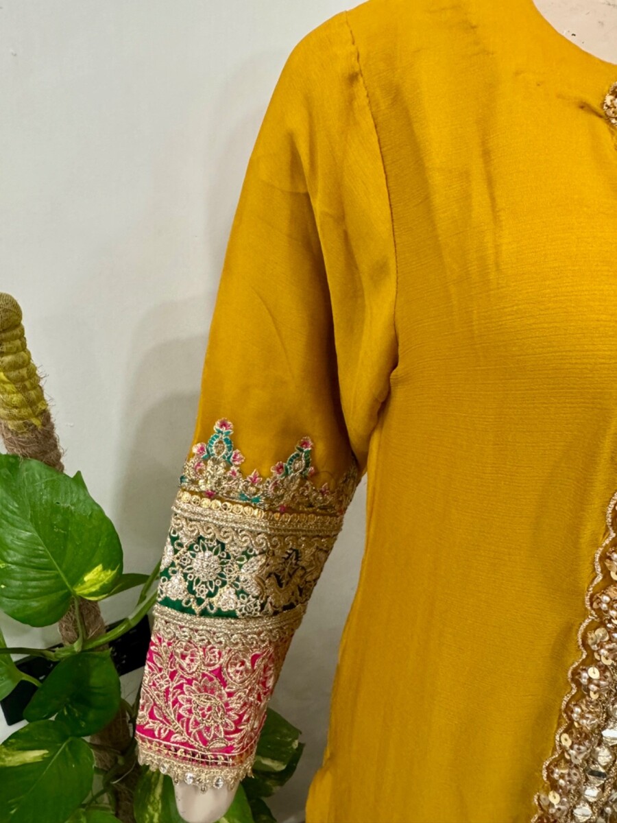 ? Yellow chiffon sharara with full thread embroidery Sequins work.