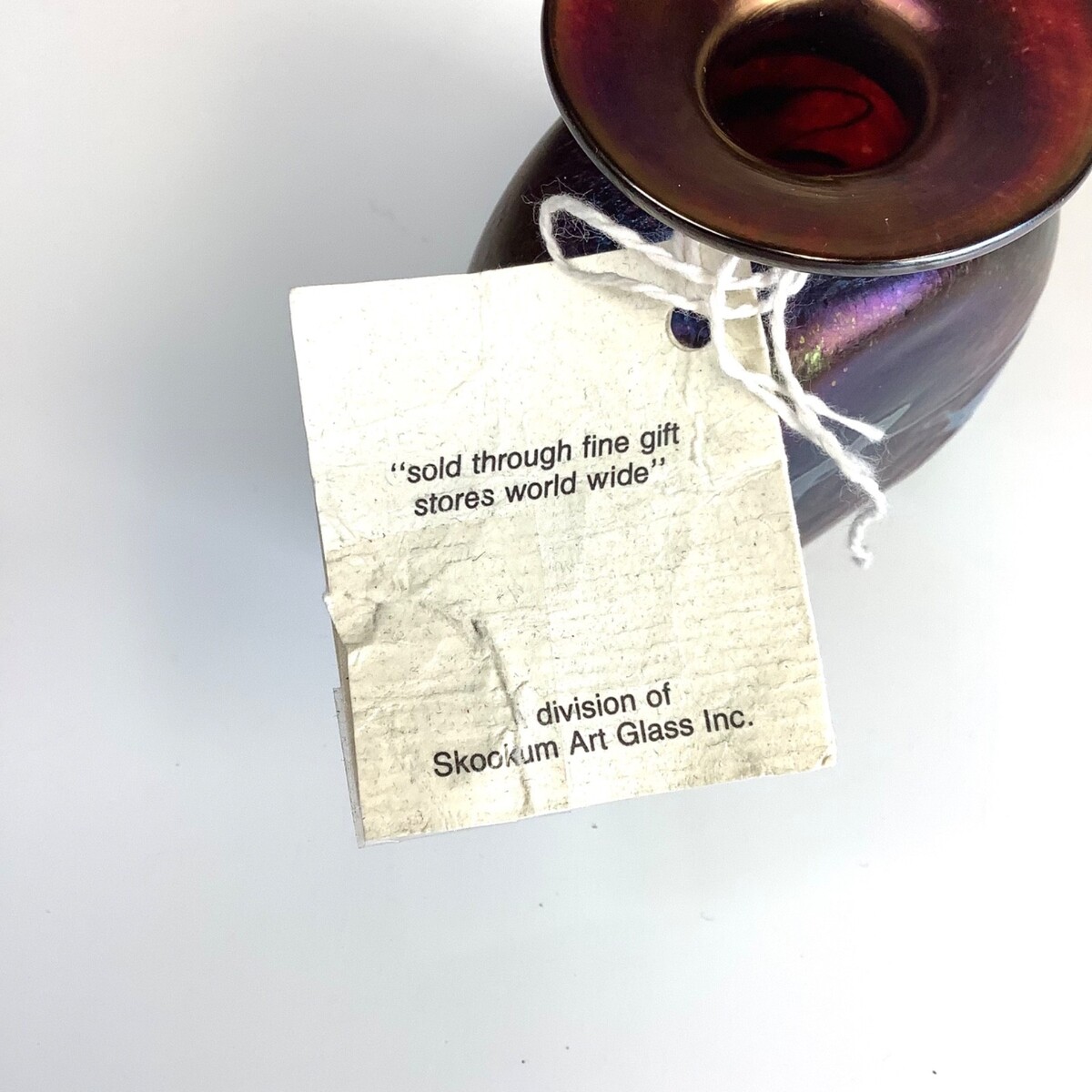 NEW with original tag (tag shows some wear). Robert Held Studio Signed Art Glass Vase Purple Swirl Iridescent w/Tag 3? High. Face is in excellent condition. Please see all photos.