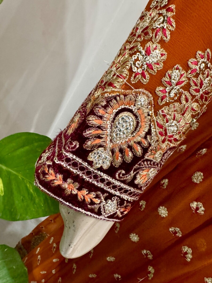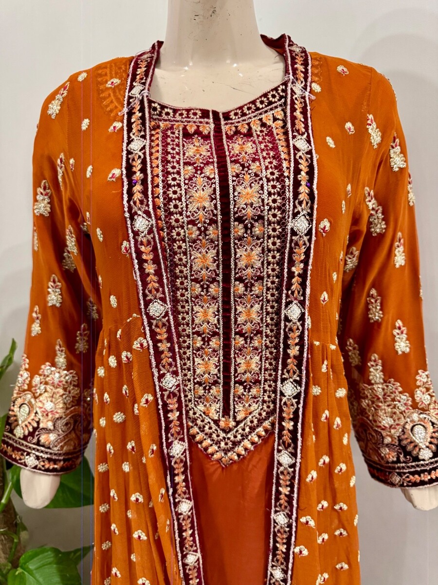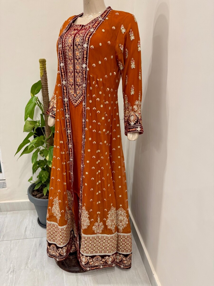 Pakistani Rust chiffon long Gown shirt Style Embroidered Sequins Dress,XL