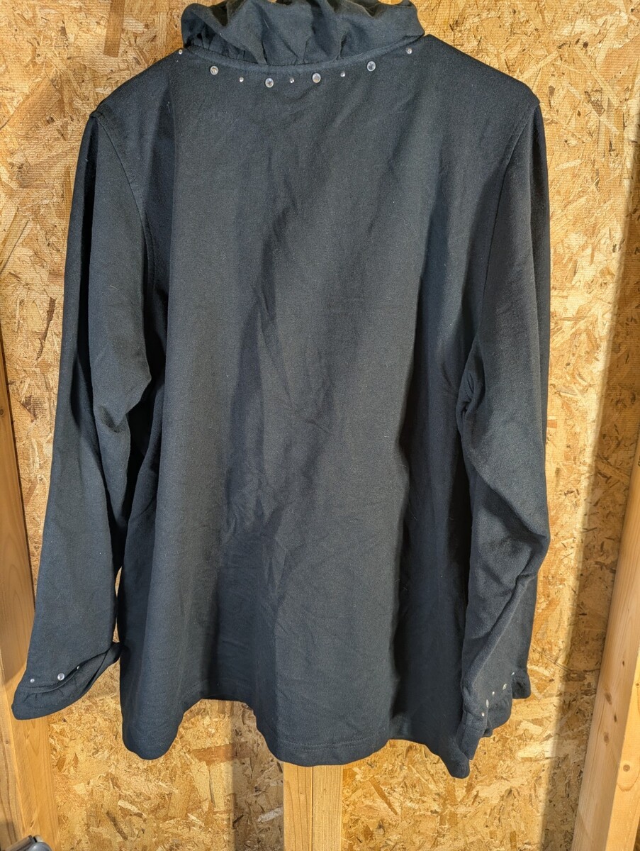 The Quacker Factory 1X Poly Cotton Jacket is a stylish and versatile outerwear option perfect for travel and casual occasions. Made from durable polycotton with a comfortable cotton lining, this short-length jacket features long sleeves, a full zip closure, and convenient pockets. The black color and solid pattern give it a classic look, while the beaded and rhinestone accents add a touch of vintage flair. With a regular fit and lightweight design, this jacket is suitable for all seasons, making it a practical and fashionable choice for any wardrobe.