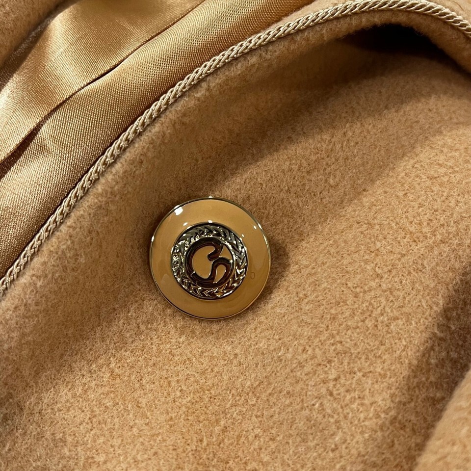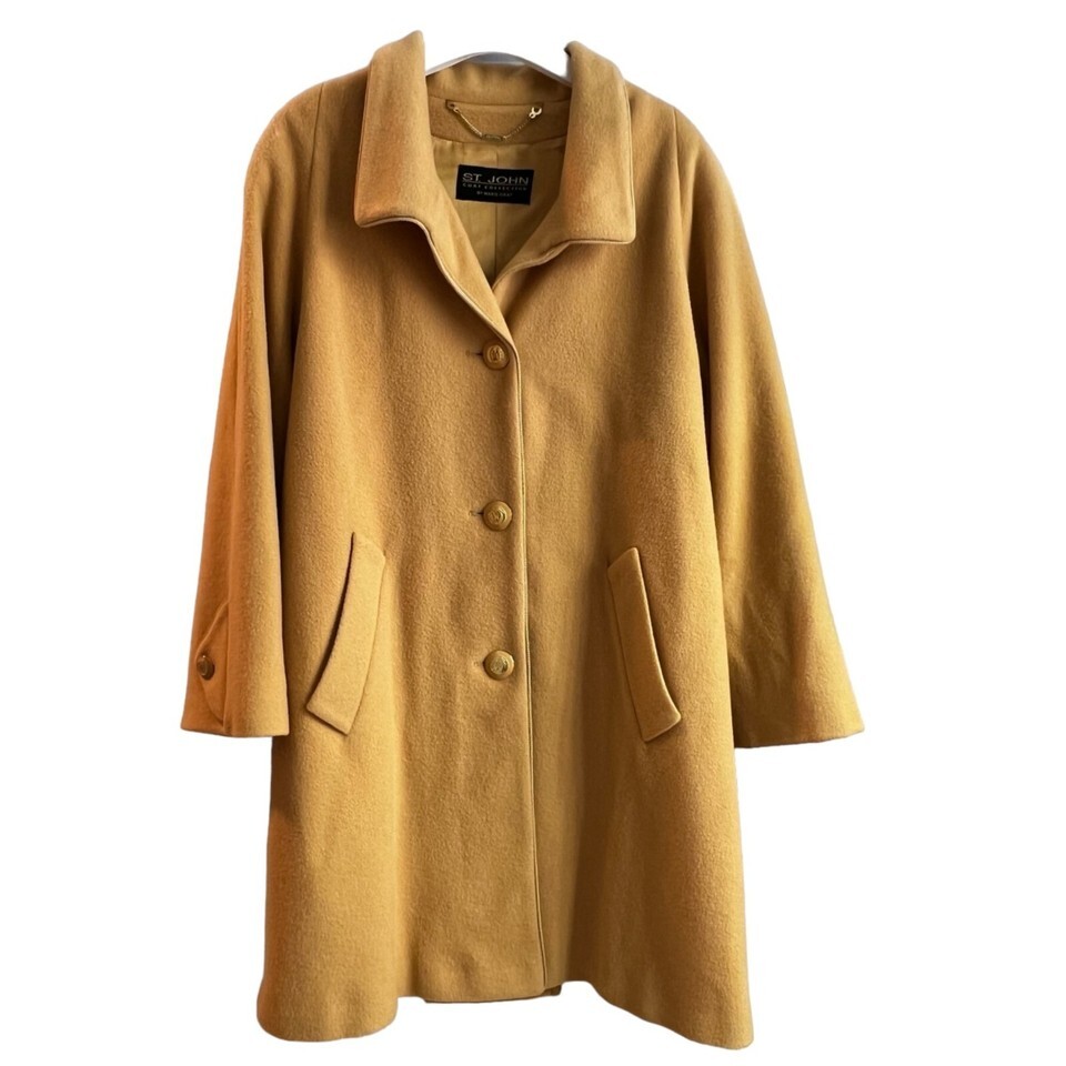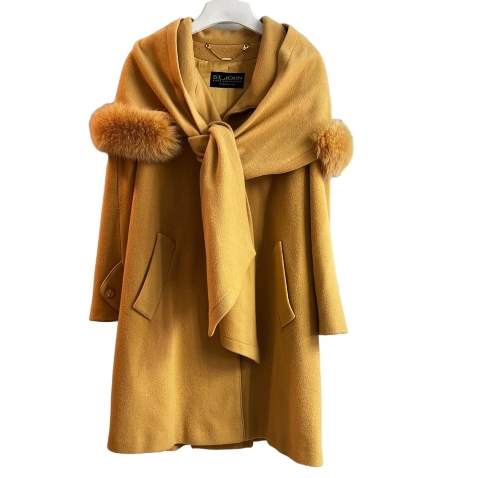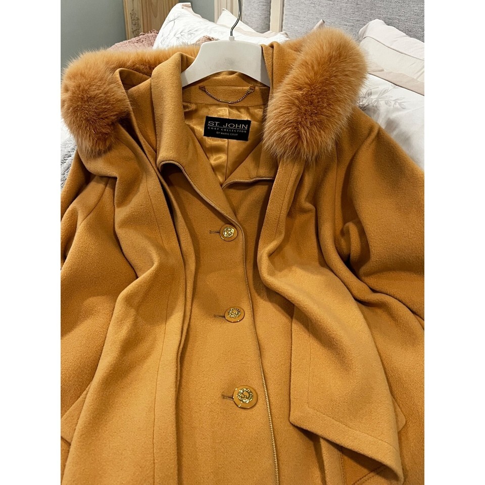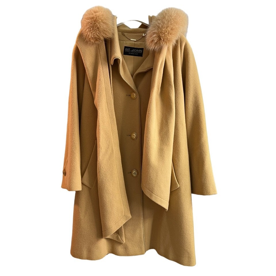 This luxurious St. John Cashmere Coat in size 10 features a stylish hooded scarf, designed for warmth and elegance. Its long, camel brown design ensures a timeless, classy look.
