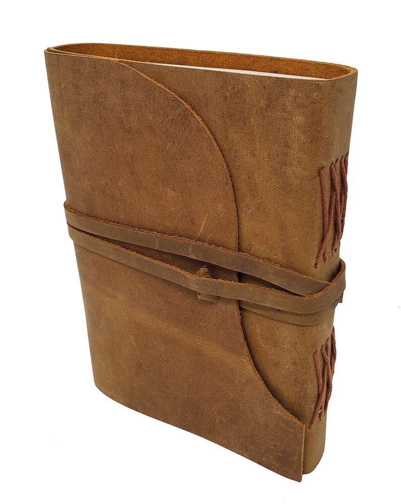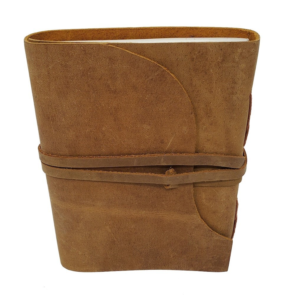 Soft leather cover and about 96 pages (192 counting front and back) with a leather cord for closure. The book measures approximately 5 inches by 7 inches - extremely charming!