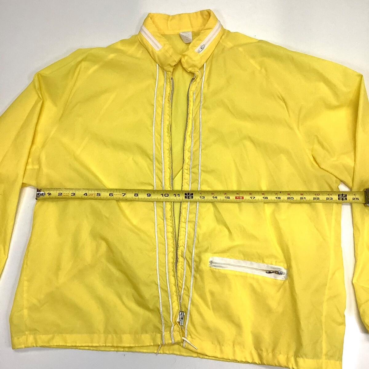 Vtg 70s Sz XL Hollywood Design Hidden Hood Yellow Windbreaker Jacket Full Zip. Good overall condition. Please see all photos. Photos include measurements for armpit to armpit and for top of shoulder to bottom of jacket.