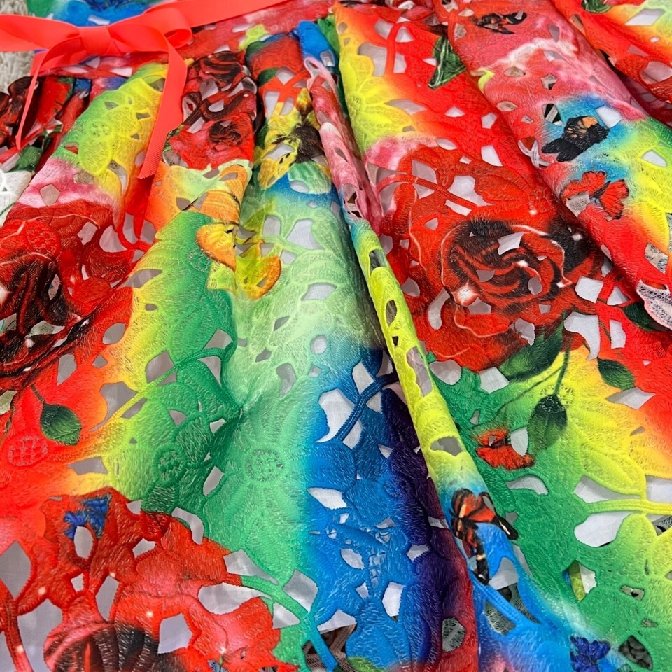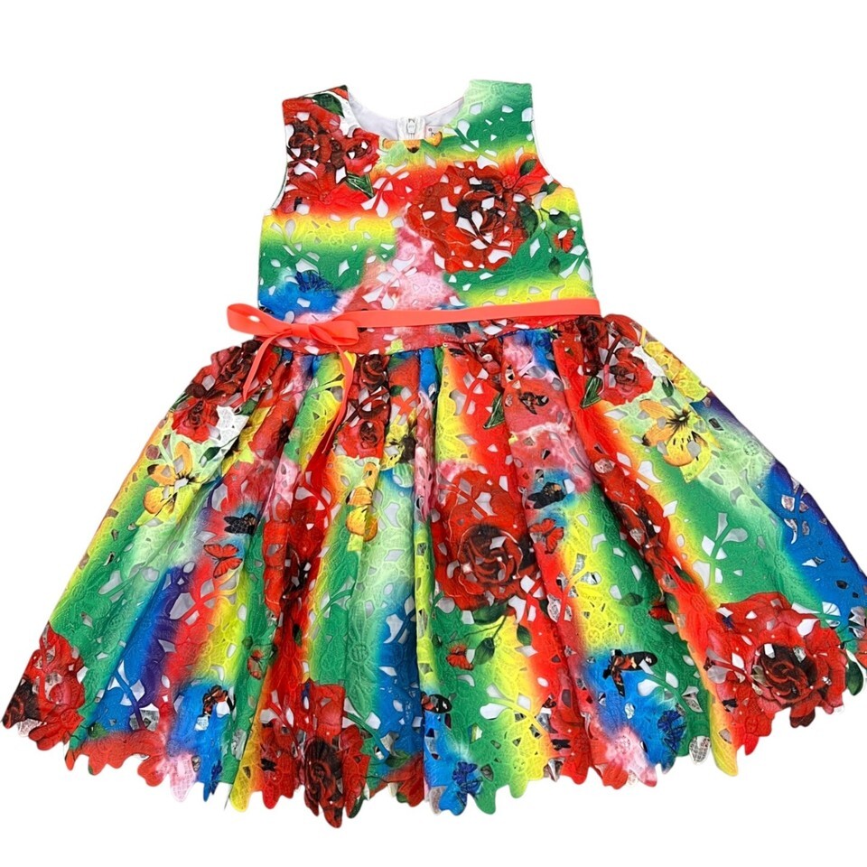 Vibrant rainbow floral dress with intricate laser-cut design. Lightweight and breathable for comfort. Ideal for bright, colorful celebrations or outings.