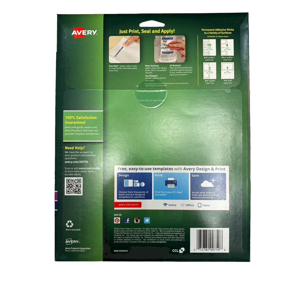 Need Labels Tough Enough to Withstand Harsh Conditions? You no longer need to tape over your labels or use a lamination machine when you've got Avery Easy Align Self-Laminating ID Labels. These labels come with a clear laminate that's easy to apply. With the Easy Align design, you can create perfect, laminated labels without bubbles or wrinkles every time--no lamination machine required. The material is UV resistant, providing extra protection against exposure to sun and other harsh environments. They're also water resistant, so surfaces can be wiped clean. Labels resist scuffing, tearing and smudging, so they remain intact and easy to read. The permanent adhesive sticks to a variety of surfaces, including plastic, wood, metal, paper, ceramic and glass. Use them as asset tags to mark your property and equipment, identify contents of containers and organize shelving in warehouses, storage areas and worksites. Also great for water bottles, food containers and shelves. Design and Print software with barcode generator makes it easy to add text,graphics, serialized numbers or barcodes in a few steps. Labels are easy to customize with free templates and designs and compatible with inkjet and laser printers.