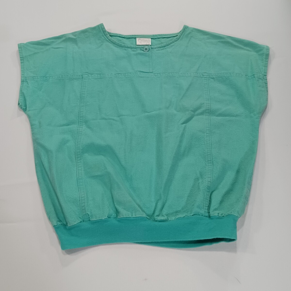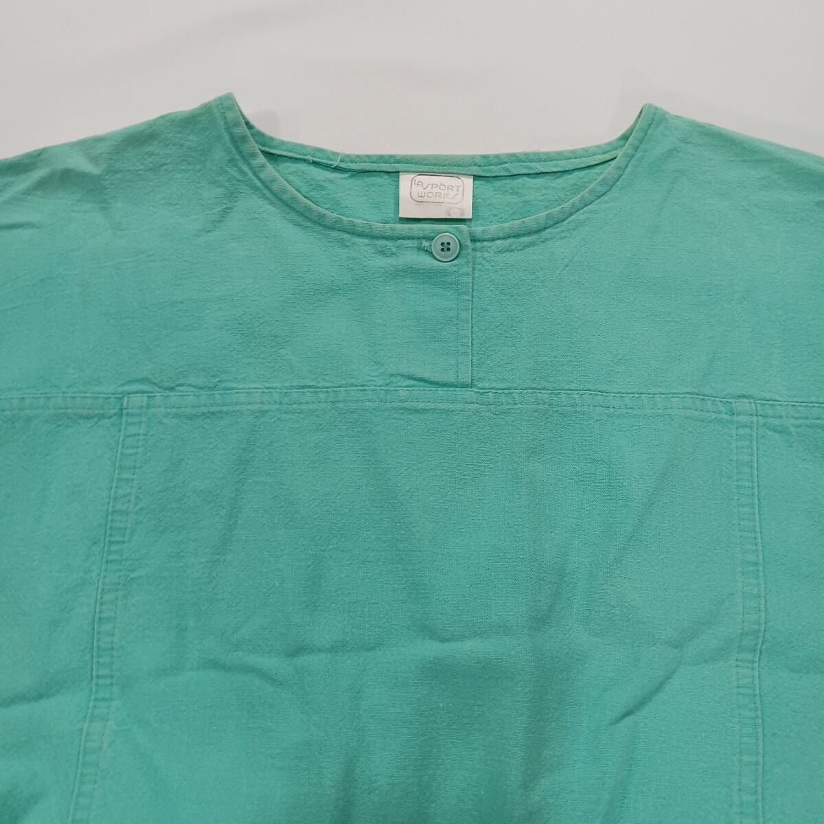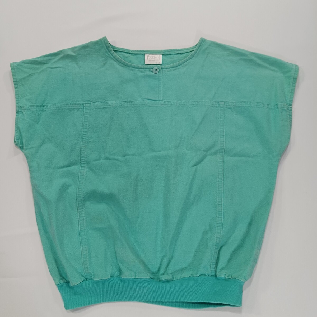 The 80s Vintage LA Sport Works Top is a women's button-up blouse in a casual and relaxed fit, perfect for everyday wear. Made of breathable cotton material, this green top features a solid pattern with a round neckline and short sleeves, giving it a classic and vintage look. The shirt also includes stylish accents like button closures and a ribbed hem, adding to its comfortable and stylish appeal. Ideal for those who appreciate retro fashion and quality craftsmanship, this blouse is a timeless addition to any wardrobe.