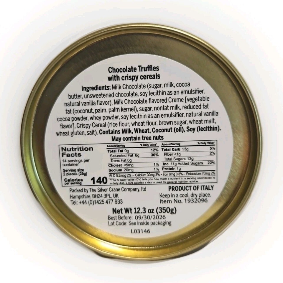 The Sivercrane Nutcracker Suite Tins 12.3 OZ are a luxurious assortment of chocolate sweets and assortments imported from Italy. These beautifully crafted tins contain a delectable selection of chocolate truffles, perfect for satisfying your sweet tooth. With a calorie count of 140 per serving, these indulgent treats are sure to satisfy your cravings for a long time to come, thanks to their extended expiration date of 02/2026. Treat yourself to this exquisite chocolate experience.