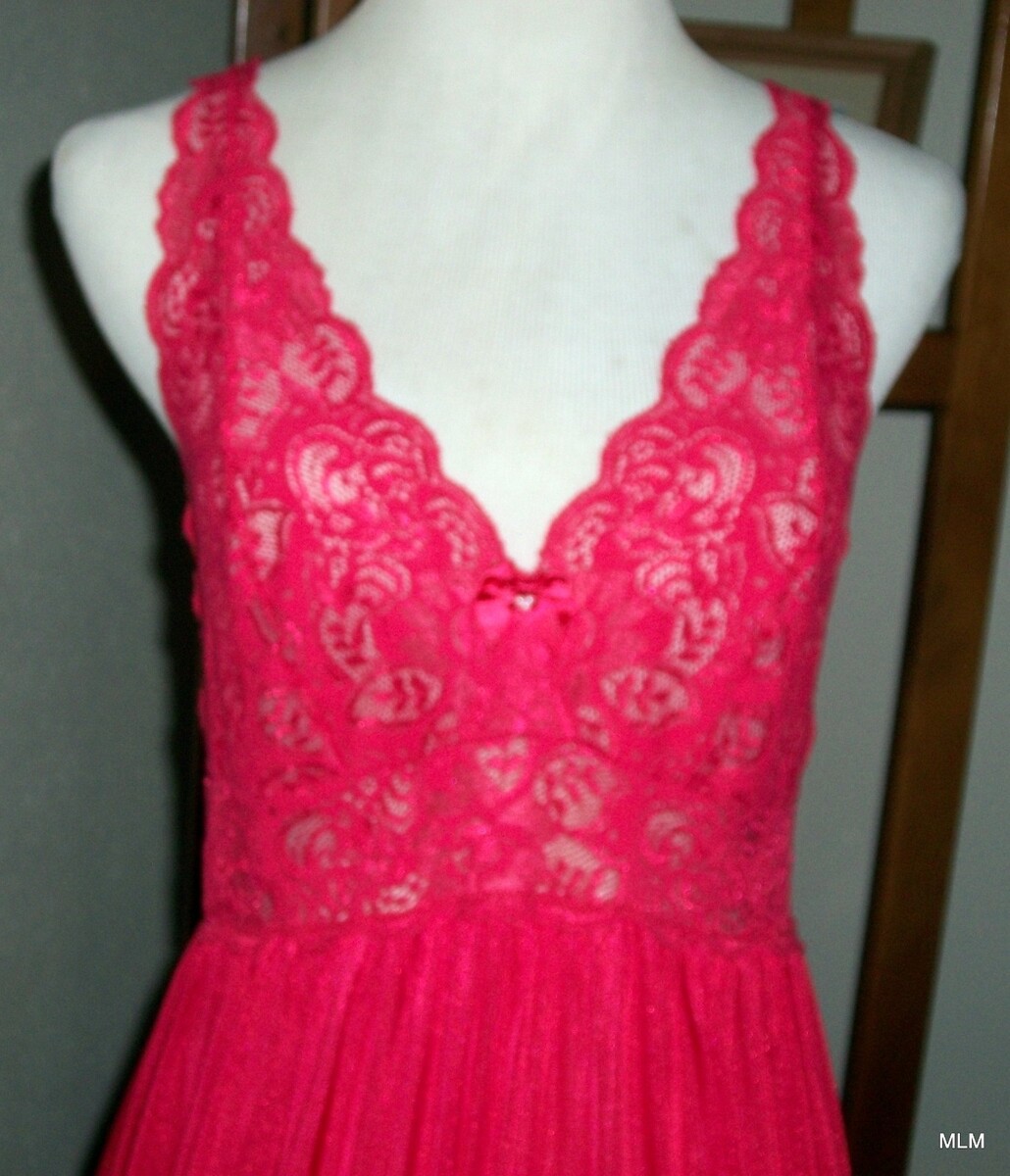 Nightgown: form-fitting lace bodice complements the flowy and gathered long skirt of the nightgown. Sleeveless stretch lace bodice with delicate satin bow and seedpearl accents at the center front.
