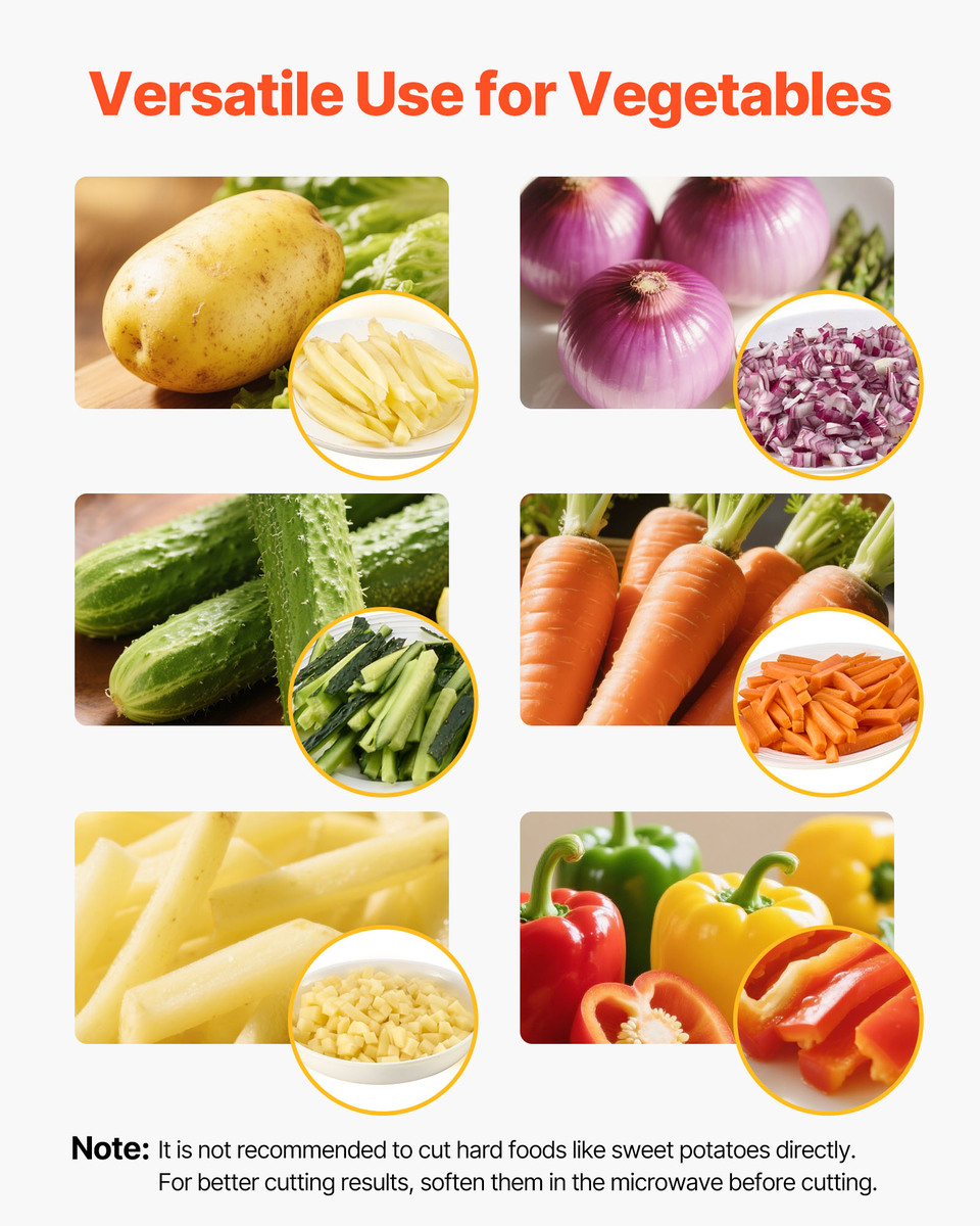 Upgraded Blades: This French fry cutter features food-grade 420J2 stainless steel blades in 1/4", 1/2", and 3/8" sizes. Easily cuts potatoes, carrots, cucumbers, and more. For hard food like sweet potatoes, microwave them first for smoother cuts