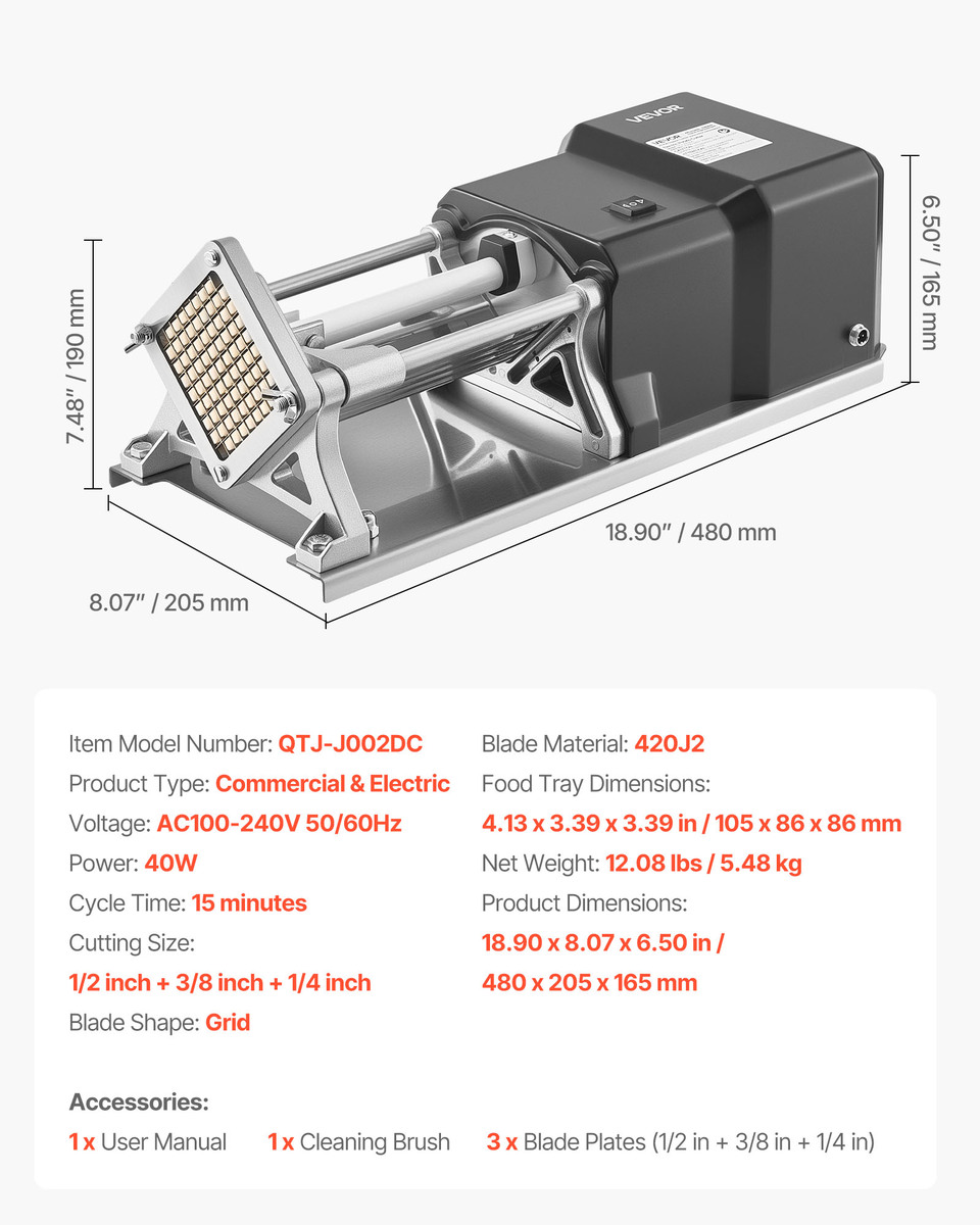 VEVOR Electric French Fry Cutter 3 Blades(1/2 "3/8 "1/4 ") Stainless Steel
