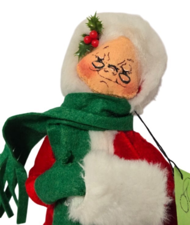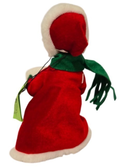 Features: The doll features a red felt hooded coat with white fur trim, a green scarf with tassels, and hand warmers (muff).